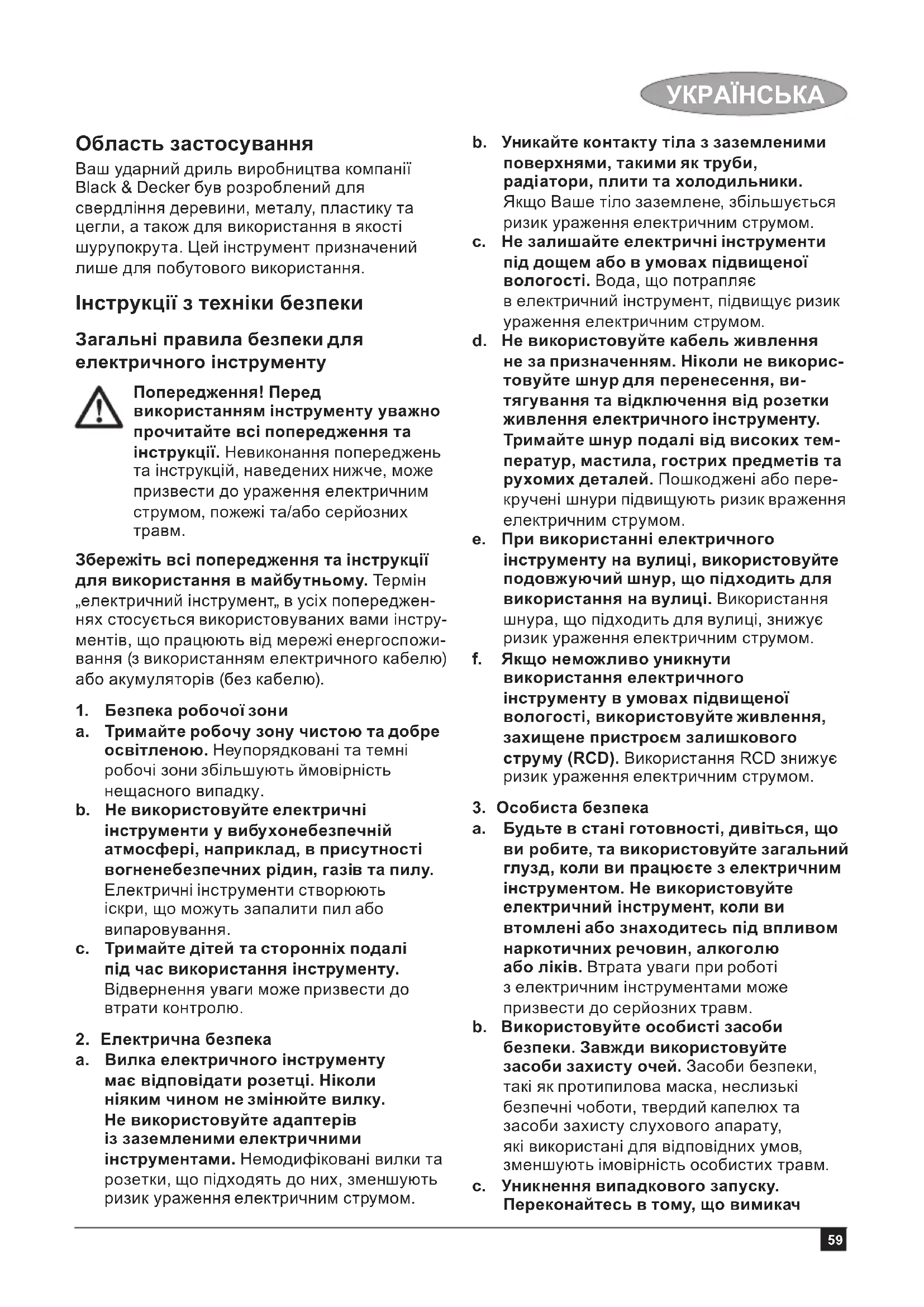 Область застосування Ваш ударний дриль виробництва компанії Black & Decker був розроблений для свердління деревини, металу, пластику та цегли, а також для використання в якості шурупокрута. Цей інструмент призначений лише для побутового використання. Інструкції з техніки безпеки Загальні правила безпеки для електричного інструменту Попередження! Перед використанням інструменту уважно прочитайте всі попередження та інструкції. Невиконання попереджень та інструкцій, наведених нижче, може призвести до ураження електричним струмом, пожежі та/або серйозних