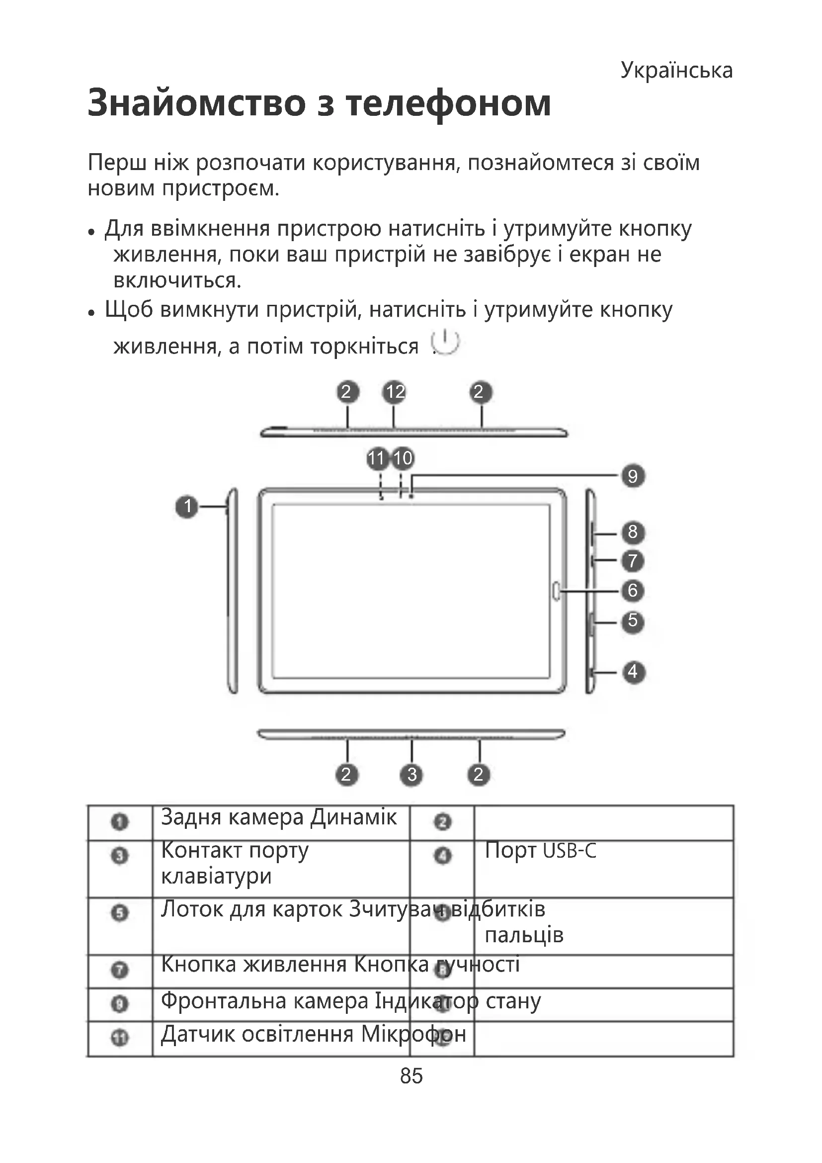Кнопка живлення Кнопка гучності Фронтальна камера Індикатор стану Датчик освітлення Мікрофон