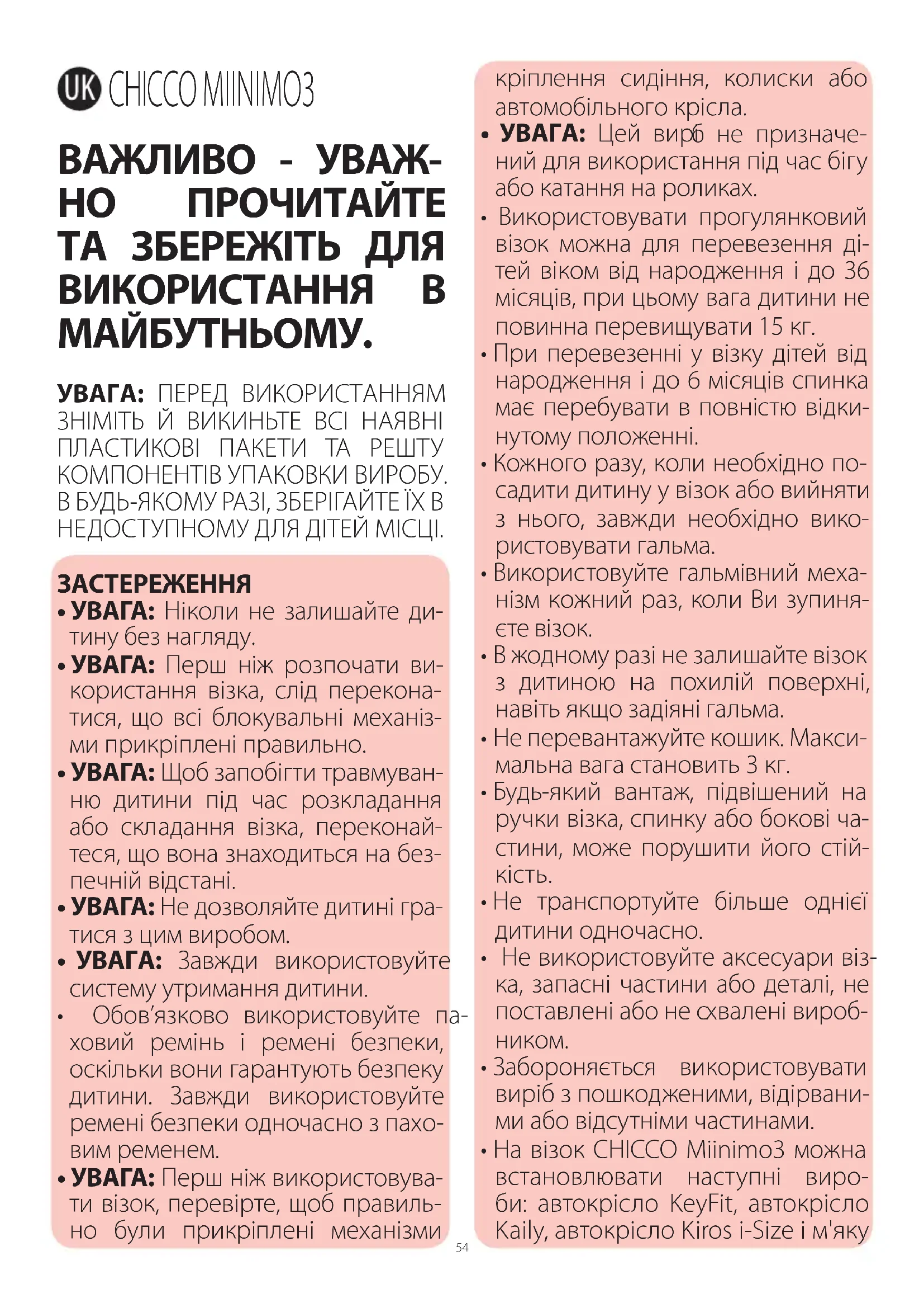 CHICCO MIINIMO3 ВАЖЛИВО - УВАЖ- НО ПРОЧИТАЙТЕ ТА ЗБЕРЕЖІТЬ ДЛЯ ВИКОРИСТАННЯ В МАЙБУТНЬОМУ. УВАГА: ПЕРЕД ВИКОРИСТАННЯМ ЗНІМІТЬ Й ВИКИНЬТЕ ВСІ НАЯВНІ ПЛАСТИКОВІ ПАКЕТИ ТА РЕШТУ КОМПОНЕНТІВ УПАКОВКИ ВИРОБУ. В БУДЬ-ЯКОМУ РАЗІ, ЗБЕРІГАЙТЕ ЇХ В НЕДОСТУПНОМУ ДЛЯ ДІТЕЙ МІСЦІ. ЗАСТЕРЕЖЕННЯ