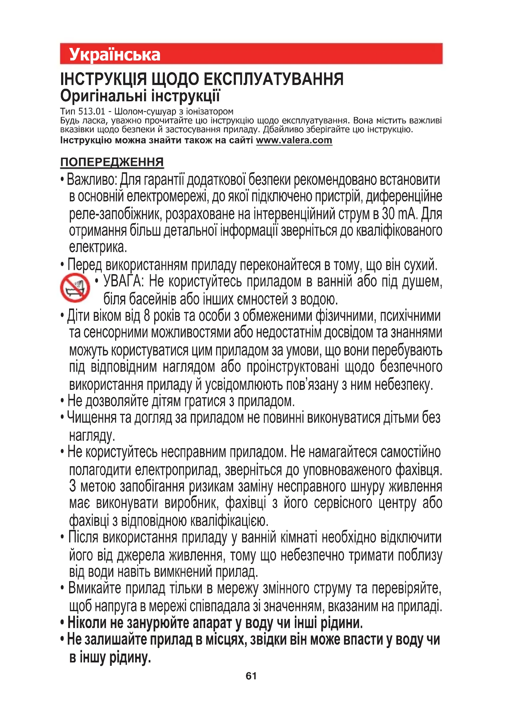 ІНСТРУКЦІЯ ЩОДО ЕКСПЛУАТУВАННЯ Оригінальні інструкції Тип 513.01 - Шолом-сушуар з іонізатором Будь ласка, уважно прочитайте цю інструкцію щодо експлуатування. Вона містить важливі вказівки щодо безпеки й застосування приладу. Дбайливо зберігайте цю інструкцію. Інструкцію можна знайти також на сайті www.valera.com ПОПЕРЕДЖЕННЯ