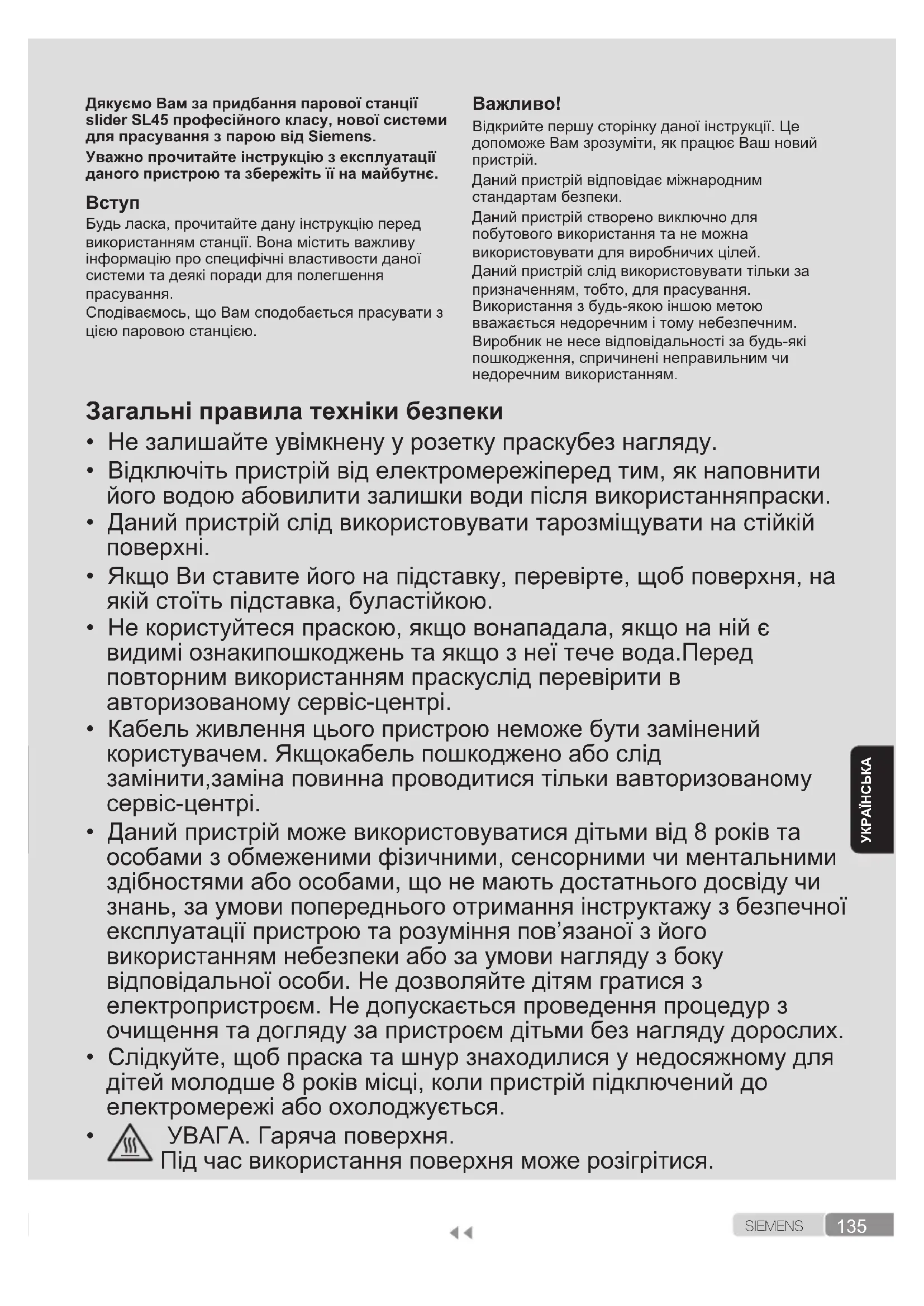 УВАГА. Гаряча поверхня. Під час використання поверхня може розігрітися.136 S I E M E N S