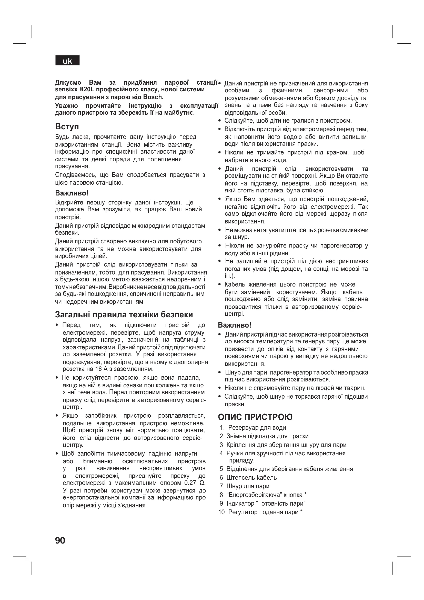 Будь ласка, прочитайте дану інструкцію перед використанням станції. Вона містить важливу інформацію про специфічні властивости даної системи та деякі поради для полегшення прасування. Сподіваємось, що Вам сподобається прасувати з цією паровою станцією.