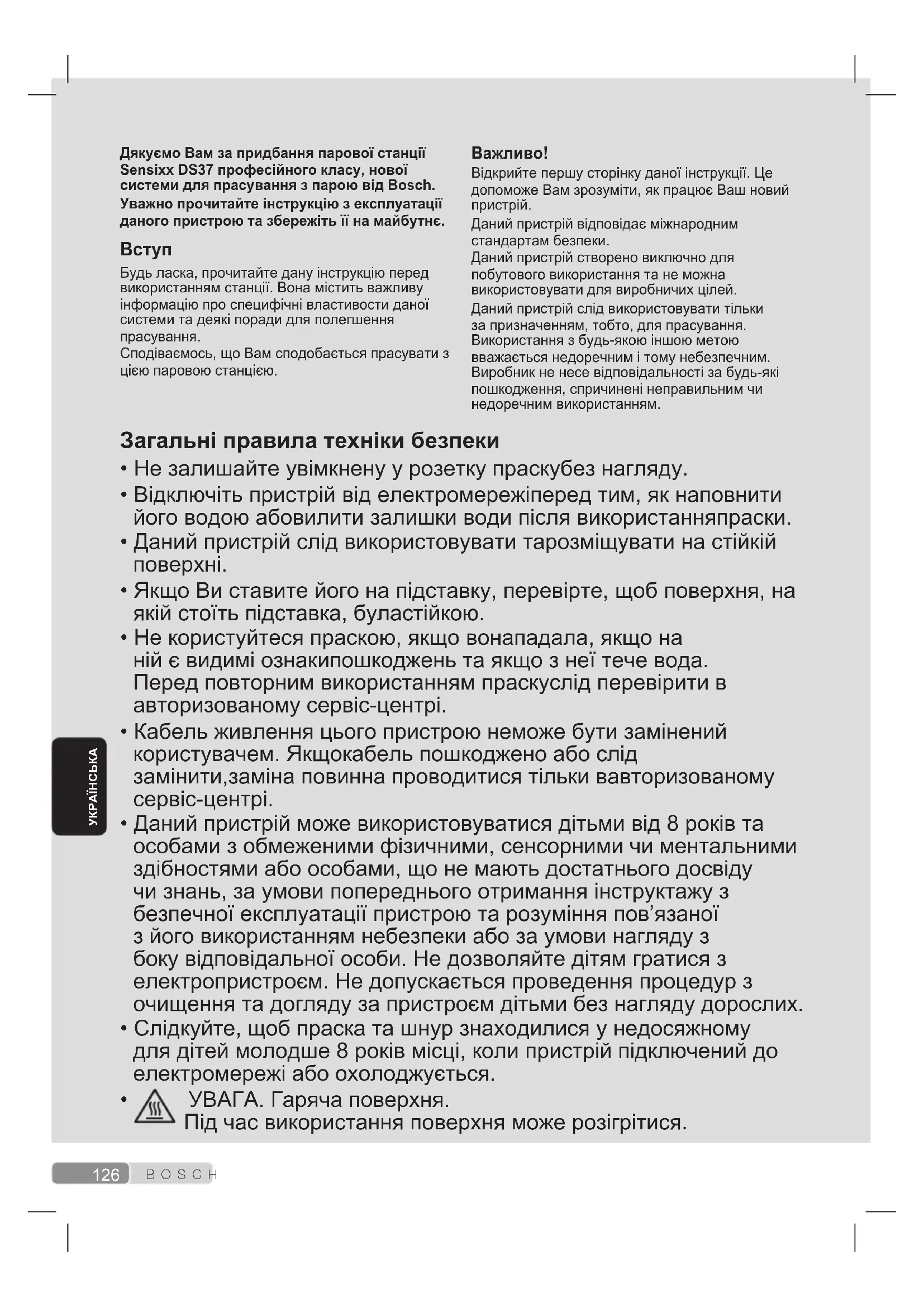ДякуємоВамзапридбанняпаровоїстанції SensixxDS37професійногокласу,нової системидляпрасуваннязпароювідBosch. Уважнопрочитайтеінструкціюзексплуатації даногопристроютазбережітьїїнамайбутнє.