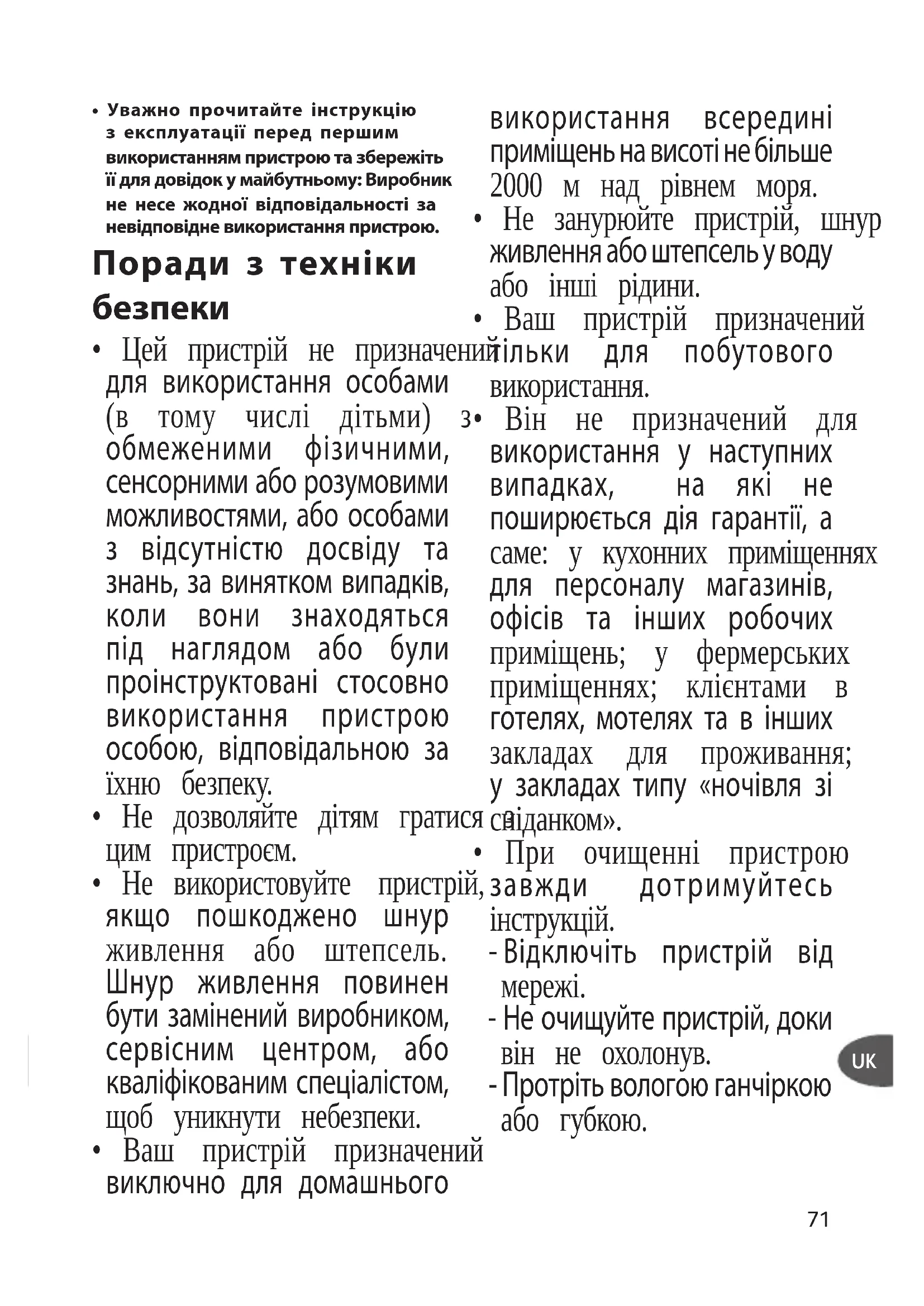 - Уважно прочитайте інструкцію з експлуатації перед першим використанням пристрою та збережіть її для довідок у майбутньому: Виробник не несе жодної відповідальності за невідповідне використання пристрою. Поради з техніки