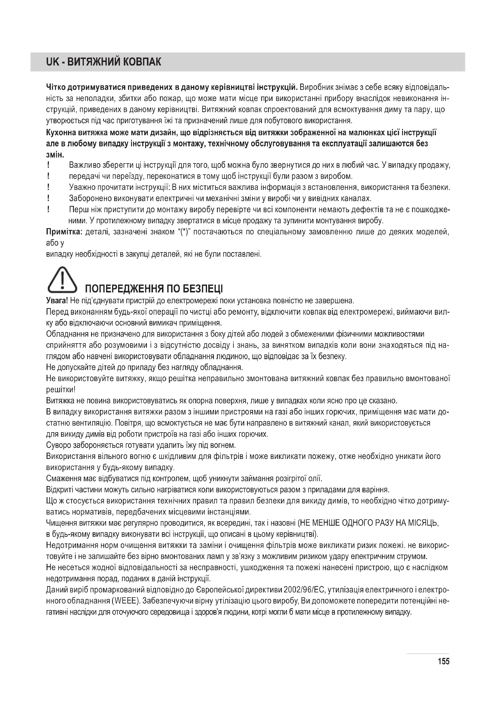 Витяжка не повина використовуватись як опорна поверхня, лише у випадках коли ясно про це сказано. В випадку використання витяжки разом з іншими пристроями на газі або інших горючих, приміщення має мати до- статню вентиляцію. Повітря, що всмоктується не має бути направлено в витяжний канал, який використовується для викиду димів від роботи пристроїв на газі або інших горючих. Суворо забороняється готувати удалить їжу під вогнем. Використання вільного вогню є шкідливим для фільтрів і може викликати пожежу, отже необхідно уникати його використання у будь-якому випадку. Смаження має відбуватися під контролем, щоб уникнути займання розігрітої олії. Відкриті частини можуть сильно нагріватися коли використовуються разом з приладами для варіння. Що ж стосується використання технічних правил та правил безпеки для викиду димів, то необхідно чітко дотриму- ватись нормативів, передбачених місцевими інстанціями. Чищення витяжки має регулярно проводитися, як всередині, так і назовні (НЕ МЕНШЕ ОДНОГО РАЗУ НА МІСЯЦЬ, в будь-якому випадку виконувати всі інструкції, що описані в цьому керівництві). Недотримання норм очищення витяжки та заміни і очищення фільтрів може викликати ризик пожежі. не викорис- товуйте і не залишайте без вірно вмонтованих ламп у зв’язку з можливим ризиком удару електричним струмом. Не несеться жодної відповідальності за несправності, ушкодження та пожежі нанесені пристрою, що є наслідком недотримання порад, поданих в даній інструкції. Даний виріб промаркований відповідно до Європейської директиви 2002/96/EC, утилізація електричного і електро- нного обладнання (WEEE). Забезпечуючи вірну утілізацію цього виробу, Ви допоможете попередити потенційні не- гативні наслідки для оточуючого середовища і здоров’я людини, котрі могли б мати місце в протилежному випадку.156 С и м в о л на самому виробі або на супроводжуючому його документі вказує, що при утилізації цього виробу з ним не можна поводитися як зі звичайними побутовими відходами. Він має здаватися у відповідний пункт прийому електричного і електронного обладнання для подальшої утилізації. Здавання на злам повинно виконува- тися згідно з місцевими правилами по утилізації відходів. Для більше детальної інформації про правила поводжен- ня з такими виробами, їх утилізації і переробки звертайтесь в місцеві органи влади, в службу по утилізації відходів, або в магазин, в якому Ви придбали даний виріб. Прилад спроектовано, випробувано і виготовлено згідно з: