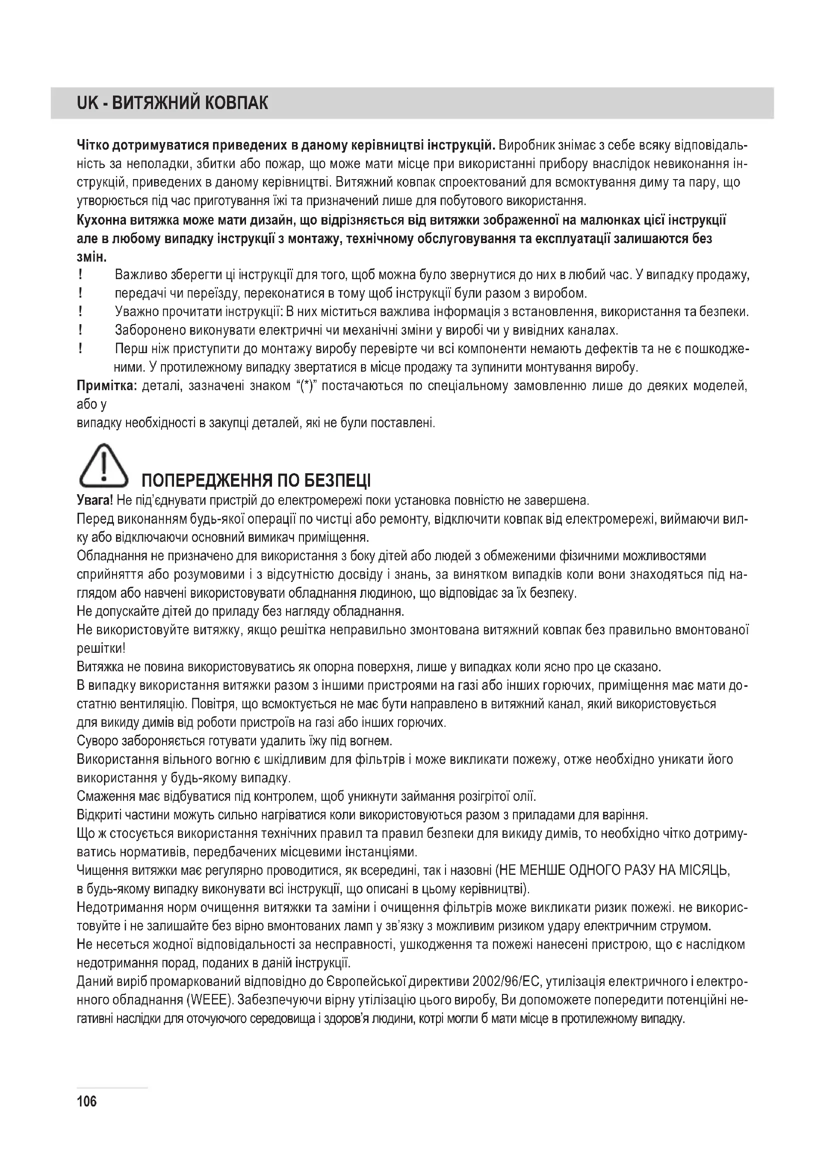 Витяжка не повина використовуватись як опорна поверхня, лише у випадках коли ясно про це сказано. В випадку використання витяжки разом з іншими пристроями на газі або інших горючих, приміщення має мати до- статню вентиляцію. Повітря, що всмоктується не має бути направлено в витяжний канал, який використовується для викиду димів від роботи пристроїв на газі або інших горючих. Суворо забороняється готувати удалить їжу під вогнем. Використання вільного вогню є шкідливим для фільтрів і може викликати пожежу, отже необхідно уникати його використання у будь-якому випадку. Смаження має відбуватися під контролем, щоб уникнути займання розігрітої олії. Відкриті частини можуть сильно нагріватися коли використовуються разом з приладами для варіння. Що ж стосується використання технічних правил та правил безпеки для викиду димів, то необхідно чітко дотриму- ватись нормативів, передбачених місцевими інстанціями. Чищення витяжки має регулярно проводитися, як всередині, так і назовні (НЕ МЕНШЕ ОДНОГО РАЗУ НА МІСЯЦЬ, в будь-якому випадку виконувати всі інструкції, що описані в цьому керівництві). Недотримання норм очищення витяжки та заміни і очищення фільтрів може викликати ризик пожежі. не викорис- товуйте і не залишайте без вірно вмонтованих ламп у зв’язку з можливим ризиком удару електричним струмом. Не несеться жодної відповідальності за несправності, ушкодження та пожежі нанесені пристрою, що є наслідком недотримання порад, поданих в даній інструкції. Даний виріб промаркований відповідно до Європейської директиви 2002/96/EC, утилізація електричного і електро- нного обладнання (WEEE). Забезпечуючи вірну утілізацію цього виробу, Ви допоможете попередити потенційні не- гативні наслідки для оточуючого середовища і здоров’я людини, котрі могли б мати місце в протилежному випадку.107 С и м в о л на самому виробі або на супроводжуючому його документі вказує, що при утилізації цього виробу з ним не можна поводитися як зі звичайними побутовими відходами. Він має здаватися у відповідний пункт прийому електричного і електронного обладнання для подальшої утилізації. Здавання на злам повинно виконува- тися згідно з місцевими правилами по утилізації відходів. Для більше детальної інформації про правила поводжен- ня з такими виробами, їх утилізації і переробки звертайтесь в місцеві органи влади, в службу по утилізації відходів, або в магазин, в якому Ви придбали даний виріб. Прилад спроектовано, випробувано і виготовлено згідно з: