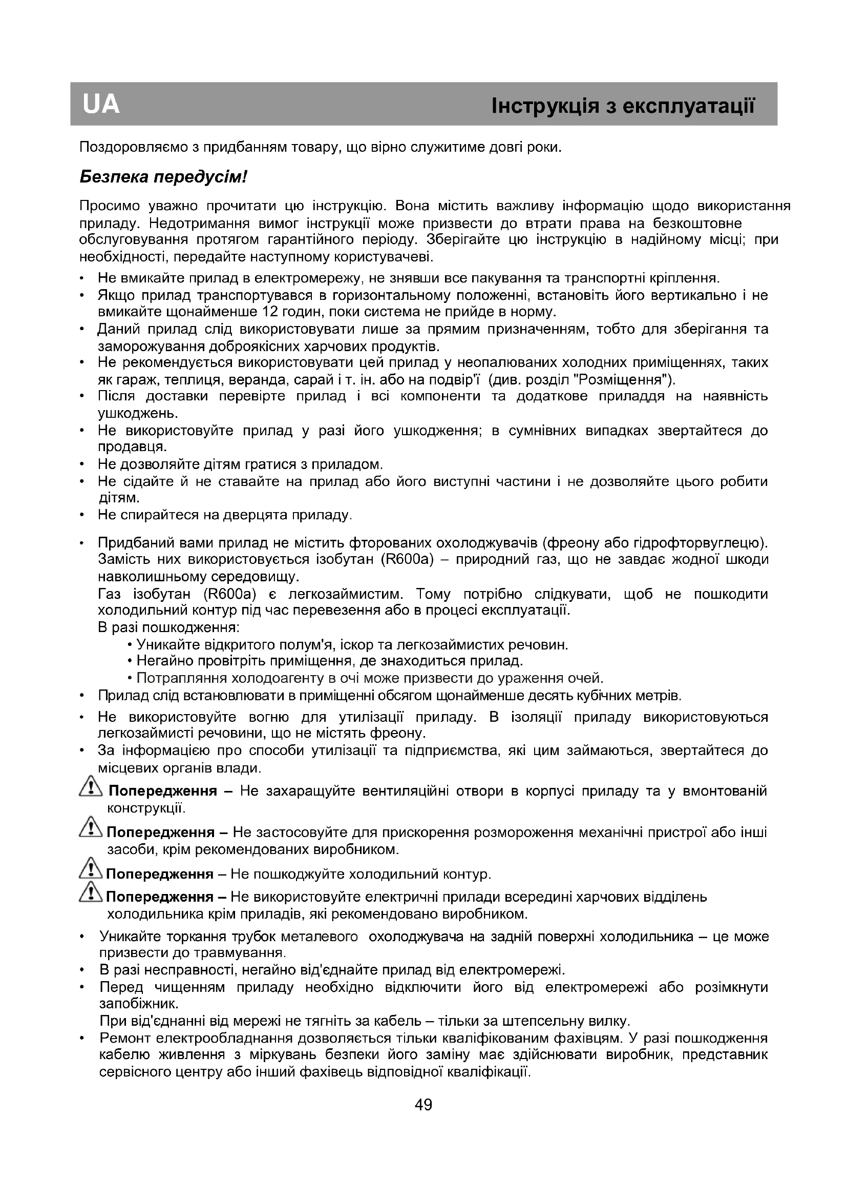 Безпека передусім! /49 Інструкції щодо транспортування /50 Встановлення приладу /50 Порядок підключення до електромережі /50 Опис приладу /51 Підготовка до експлуатації /51 Регулювання робочої температури /51 Охолодження /53 Заморожування /54 Розморожування приладу /54 Заміна лампи внутрішнього освітлення /55 Чищення та догляд /55 Практичні поради та зауваження /56 Приклади використання; Розміщення продуктів /57 Рекомендовані налаштування /57 Шуми робочого режиму /58 Практичні рекомендації щодо зниження споживання електроенергії /58 Можливі проблеми... /59 Перевішування дверцят; Технічні дані /60