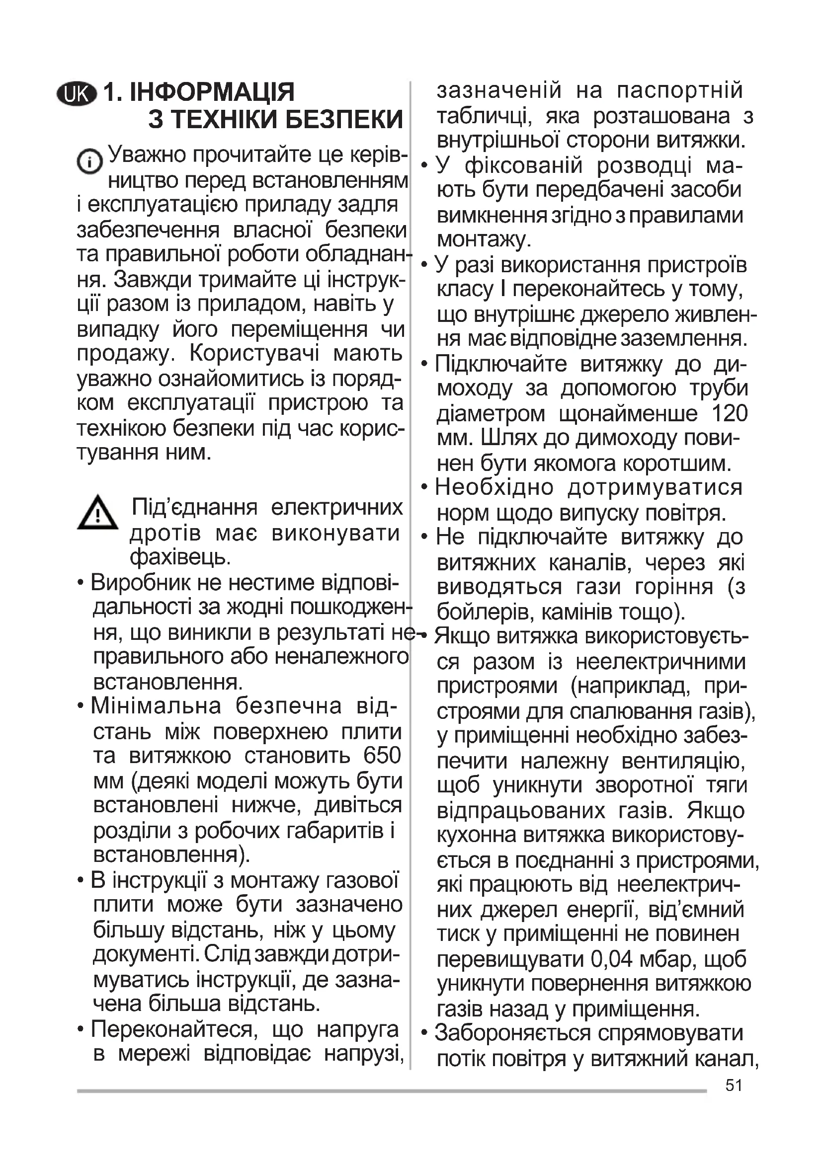 - W celu wymiany diody należy skontakto- wać się z technicznym działem Obsługi Klienta („W celu nabycia diody należy skontaktować się z technicznym działem Obsługi Klienta”).51 1.ІНФОРМАЦІЯ ЗТЕХНІКИБЕЗПЕКИ Уважно прочитайте це керів- ництво перед встановленням і експлуатацією приладу задля забезпечення власної безпеки та правильної роботи обладнан- ня. Завжди тримайте ці інструк- ції разом із приладом, навіть у випадку його переміщення чи продажу. Користувачі мають уважно ознайомитись із поряд- ком експлуатації пристрою та технікою безпеки під час корис- тування ним. Під’єднання електричних дротів має виконувати