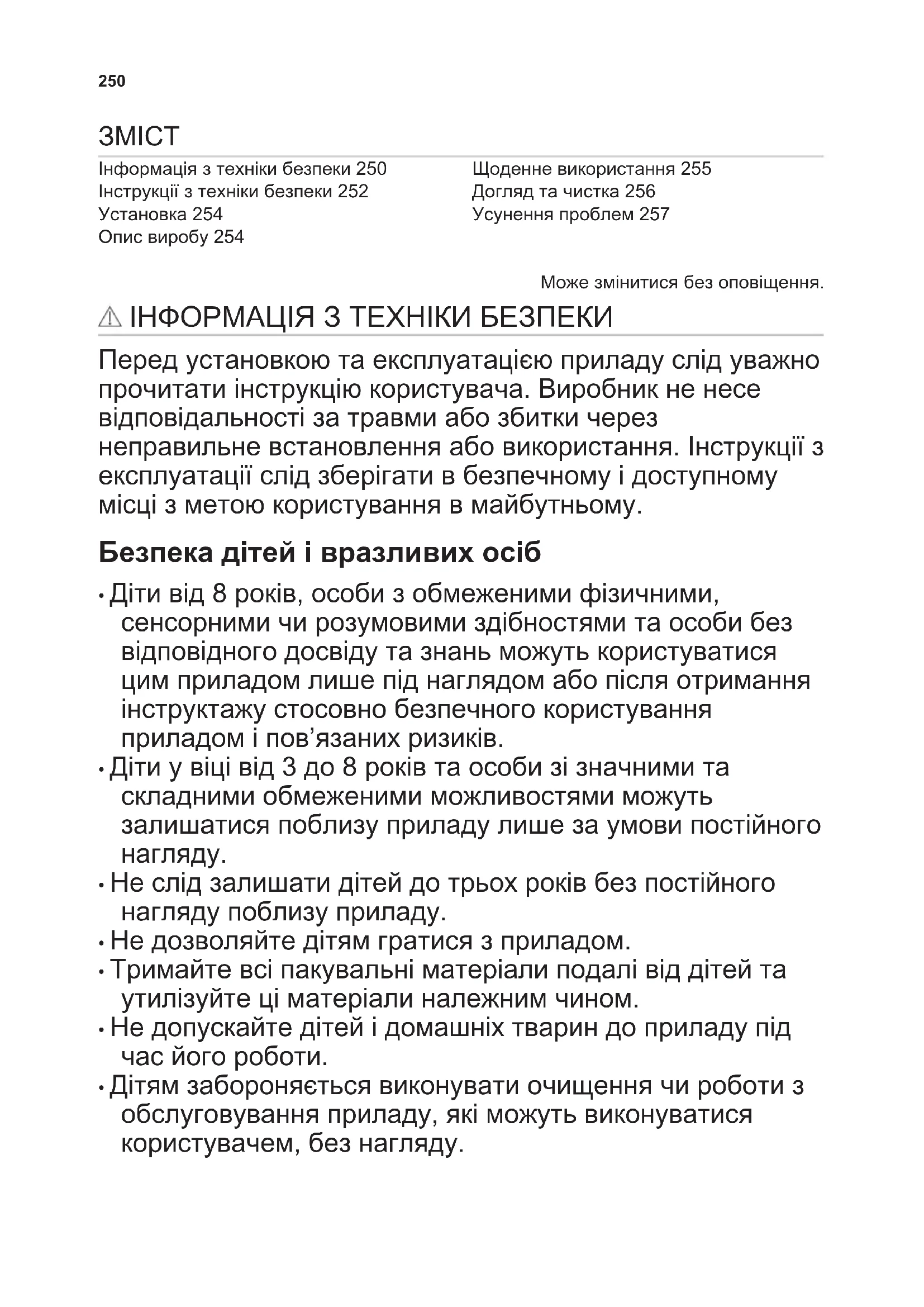 - Дітям забороняється виконувати очищення чи роботи з обслуговування приладу, які можуть виконуватися користувачем, без нагляду. 250Загальні правила безпеки