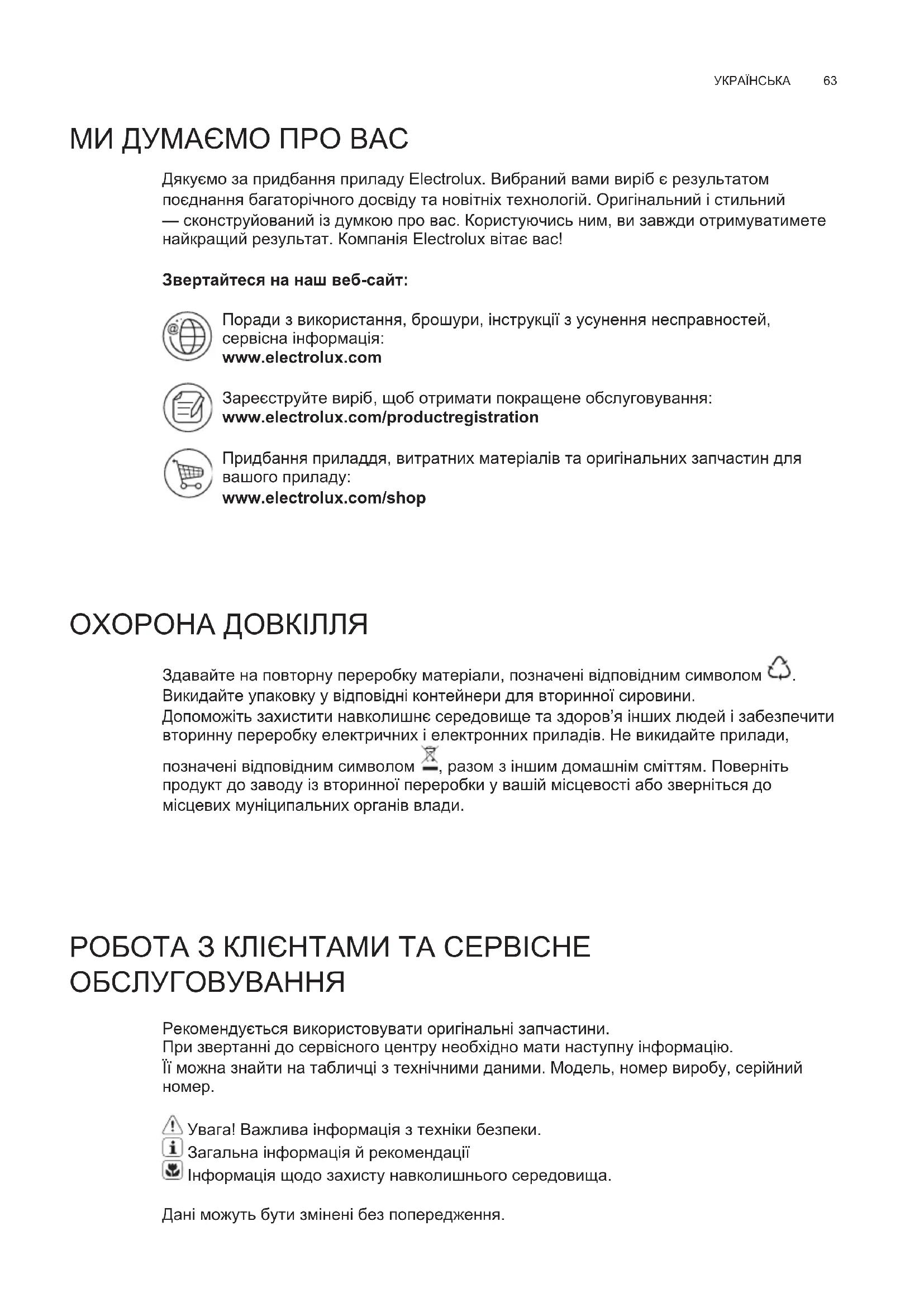 Дякуємо за придбання приладу Electrolux. Вибраний вами виріб є результатом поєднання багаторічного досвіду та новітніх технологій. Оригінальний і стильний — сконструйований із думкою про вас. Користуючись ним, ви завжди отримуватимете найкращий результат. Компанія Electrolux вітає вас! Звертайтеся на наш веб-сайт: Поради з використання, брошури, інструкції з усунення несправностей, сервісна інформація: www.electrolux.com Зареєструйте виріб , щоб отримати покращене обслуговування: www.electrolux.com/productregistration Придбання приладдя, витратних матеріалів та оригінальних запчастин для вашого приладу: www.electrolux.com/shop МИ ДУМАЄМО ПРО ВАС ОХОРОНА ДОВКІЛЛЯ Здавайте на повторну переробку матеріали, позначені відповідним символом . Викидайте упаковку у відповідні контейнери для вторинної сировини. Допоможіть захистити навколишнє середовище та здоров’я інших людей і забезпечити вторинну переробку електричних і електронних приладів. Не викидайте прилади, позначені відповідним символом , разом з іншим домашнім сміттям. Поверніть продукт до заводу із вторинної переробки у вашій місцевості або зверніться до місцевих муніципальних органів влади. РОБОТА З КЛІЄНТАМИ ТА СЕРВІСНЕ ОБСЛУГОВУВАННЯ Рекомендується використовувати оригінальні запчастини. При звертанні до сервісного центру необхідно мати наступну інформацію. Її можна знайти на табличці з технічними даними. Модель, номер виробу, серійний
