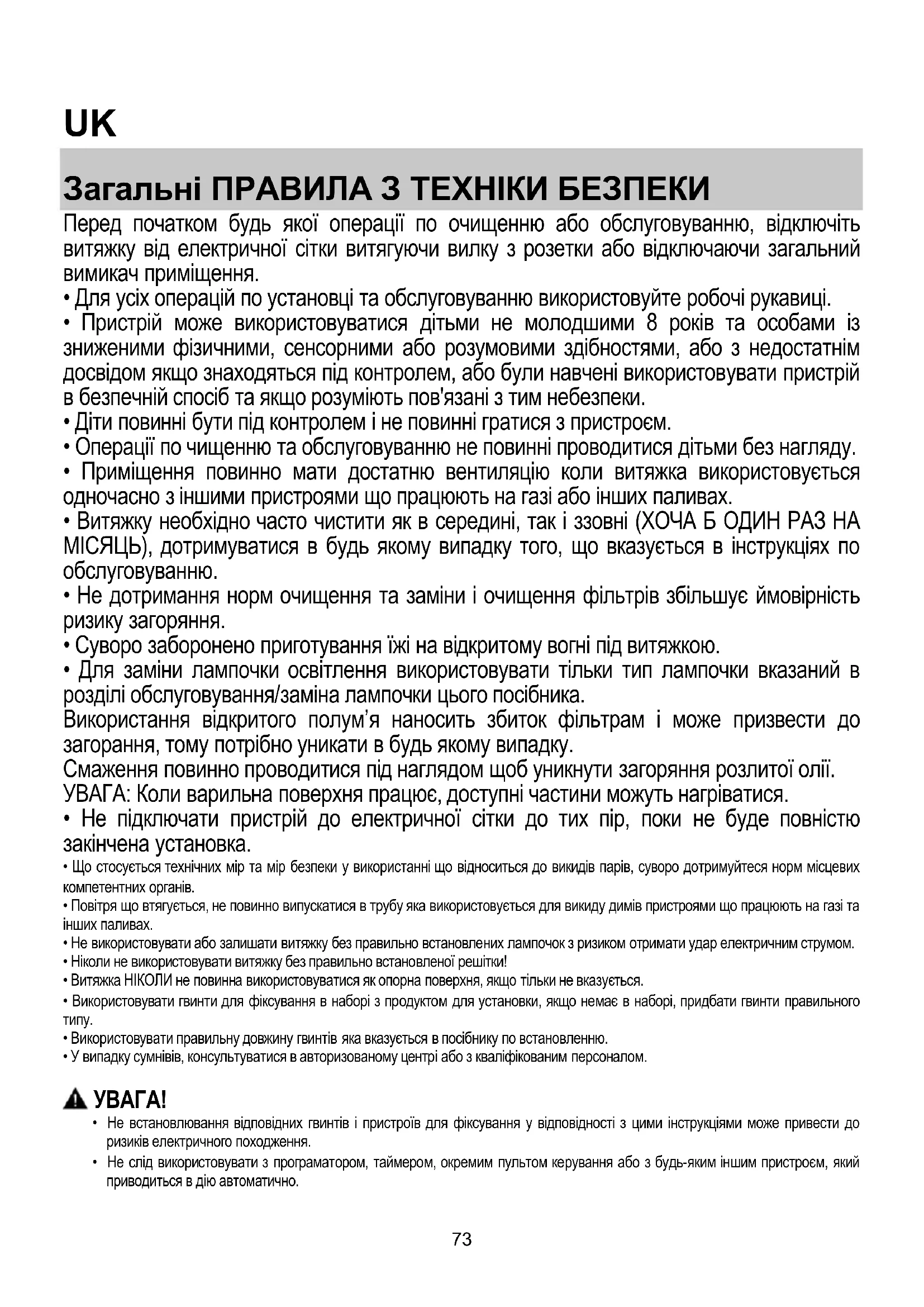 Загальні ПРАВИЛА З ТЕХНІКИ БЕЗПЕКИ Перед початком будь якої операції по очищенню або обслуговуванню, відключіть витяжку від електричної сітки витягуючи вилку з розетки або відключаючи загальний вимикач приміщення.
