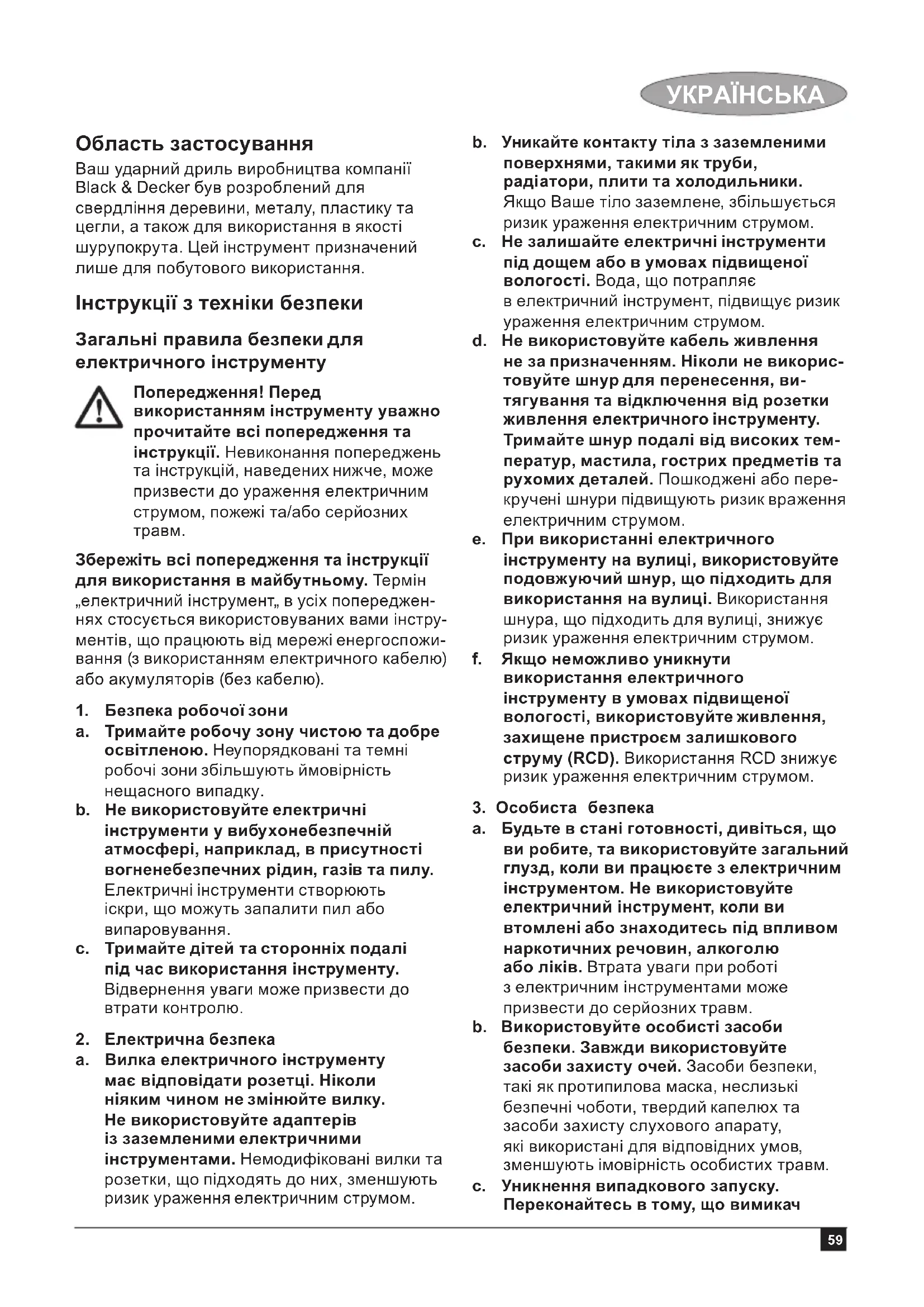 Область застосування Ваш ударний дриль виробництва компанії Black & Decker був розроблений для свердління деревини, металу, пластику та цегли, а також для використання в якості шурупокрута. Цей інструмент призначений лише для побутового використання. Інструкції з техніки безпеки Загальні правила безпеки для електричного інструменту Попередження! Перед використанням інструменту уважно прочитайте всі попередження та інструкції. Невиконання попереджень та інструкцій, наведених нижче, може призвести до ураження електричним струмом, пожежі та/або серйозних