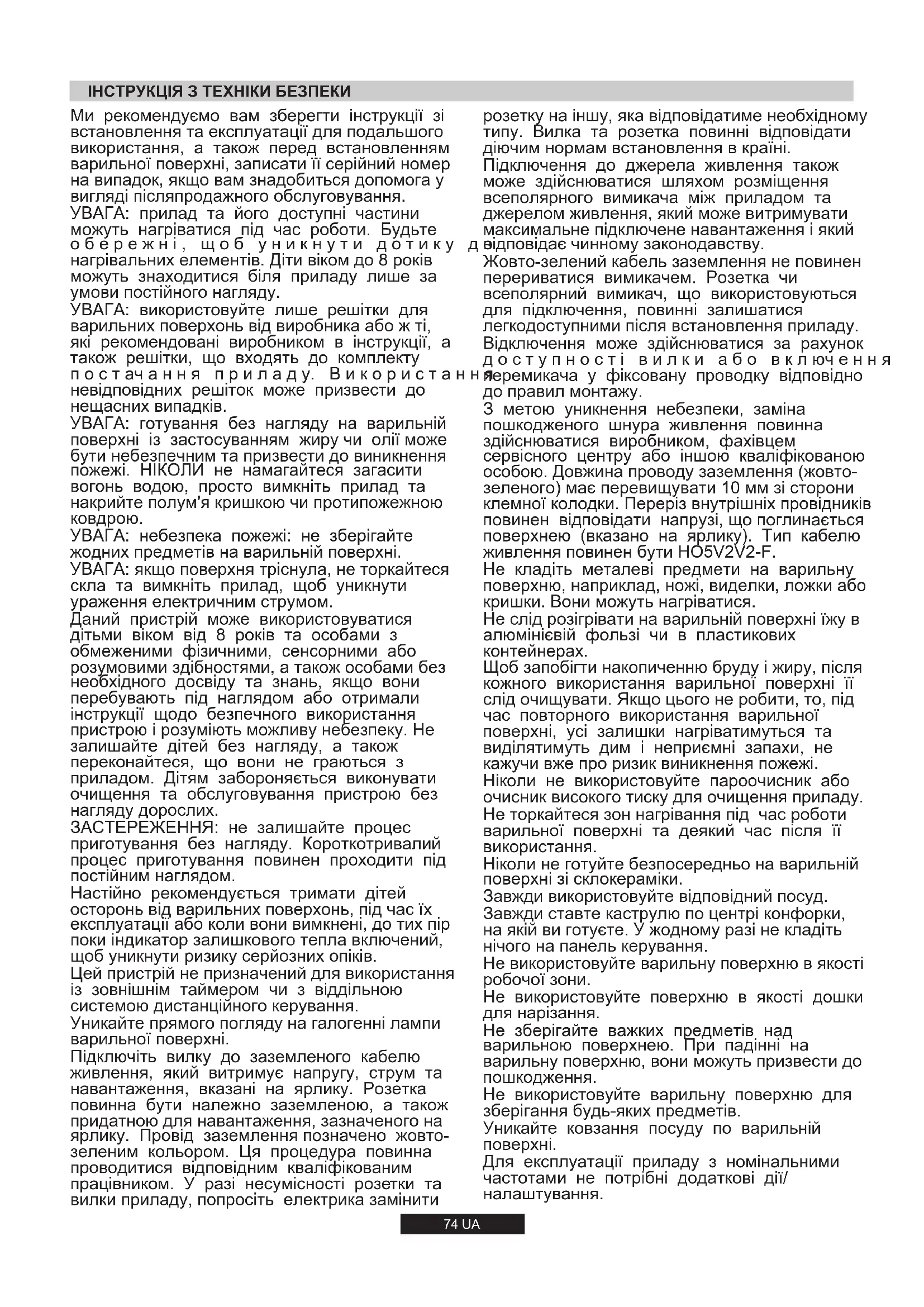 УВАГА: небезпека пожежі: не зберігайте жодних предметів на варильній поверхні. Даний пристрій може використовуватися дітьми віком від 8 років та особами з обмеженими фізичними, сенсорними або розумовими здібностями, а також особами без необхідного досвіду та знань, якщо вони перебувають під наглядом або отримали інструкції щодо безпечного використання пристрою і розуміють можливу небезпеку. Не залишайте дітей без нагляду, а також переконайтеся, що вони не граються з приладом. Дітям забороняється виконувати очищення та обслуговування пристрою без нагляду дорослих. Цей пристрій не призначений для використання із зовнішнім таймером чи з віддільною системою дистанційного керування. УВАГА: використовуйте лише решітки для варильних поверхонь від виробника або ж ті, які рекомендовані виробником в інструкції, а також решітки, що входять до комплекту п о с т ач а н н я п р и л а д у. В и к о р и с т а н н я невідповідних решіток може призвести до нещасних випадків. УВАГА: прилад та його доступні частини можуть нагріватися під час роботи. Будьте о б е р е ж н і , щ о б у н и к н у т и д о т и к у д о нагрівальних елементів. Діти віком до 8 років можуть знаходитися біля приладу лише за умови постійного нагляду. УВАГА: якщо поверхня тріснула, не торкайтеся скла та вимкніть прилад, щоб уникнути ураження електричним струмом. ЗАСТЕРЕЖЕННЯ: не залишайте процес приготування без нагляду. Короткотривалий процес приготування повинен проходити під постійним наглядом. Ми рекомендуємо вам зберегти інструкції зі встановлення та експлуатації для подальшого використання, а також перед встановленням варильної поверхні, записати її серійний номер на випадок, якщо вам знадобиться допомога у вигляді післяпродажного обслуговування. Уникайте прямого погляду на галогенні лампи варильної поверхні. Підключіть вилку до заземленого кабелю живлення, який витримує напругу, струм та навантаження, вказані на ярлику. Розетка повинна бути належно заземленою, а також придатною для навантаження, зазначеного на ярлику. Провід заземлення позначено жовто- зеленим кольором. Ця процедура повинна проводитися відповідним кваліфікованим працівником. У разі несумісності розетки та вилки приладу, попросіть електрика замінити ІНСТРУКЦІЯ З ТЕХНІКИ БЕЗПЕКИ 74 UA Уникайте ковзання посуду по варильній
