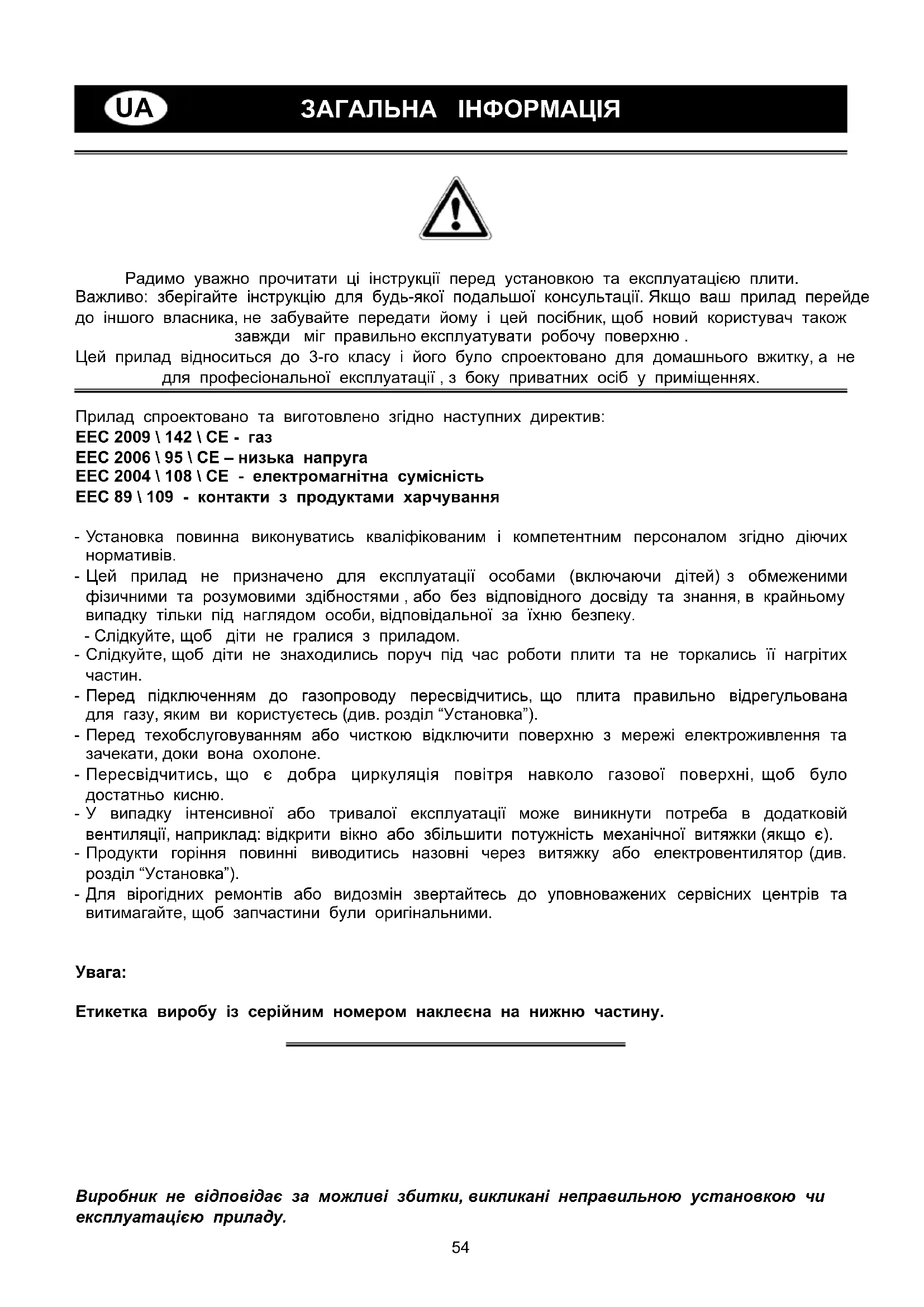 Етикетка виробу із серійним номером наклеєна на нижню частину. Виробник не відповідає за можливі збитки, викликані неправильною установкою чи експлуатацією приладу. UA55