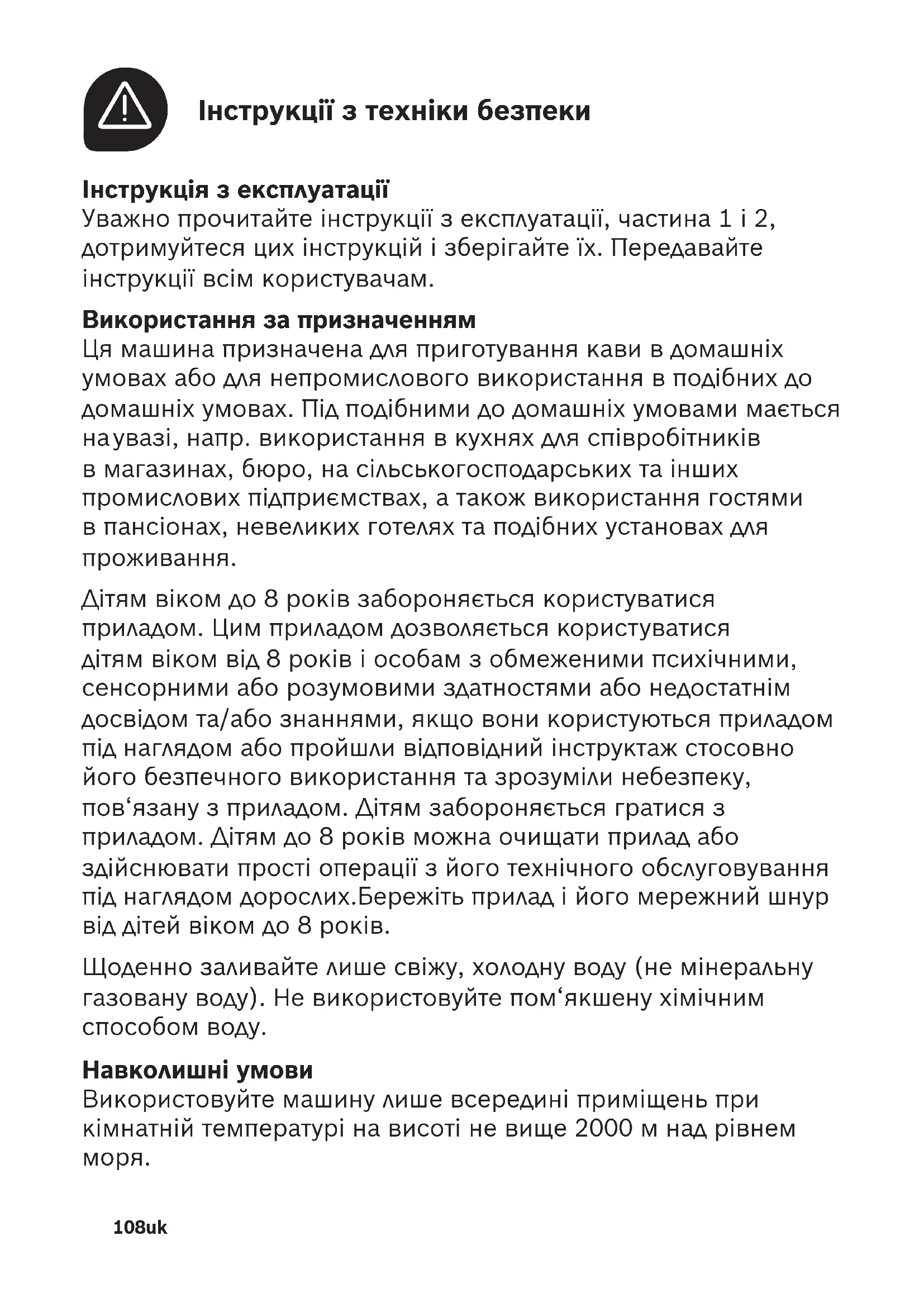 Інструкція з експлуатації Уважно прочитайте інструкції з експлуатації, частина 1 і 2, дотримуйтеся цих інструкцій і зберігайте їх. Передавайте інструкції всім користувачам. Використання за призначенням Ця машина призначена для приготування кави в домашніх умовах або для непромислового використання в подібних до домашніх умовах. Під подібними до домашніх умовами мається на увазі, напр. використання в кухнях для співробітників в магазинах, бюро, на сільськогосподарських та інших промислових підприємствах, а також використання гостями в пансіонах, невеликих готелях та подібних установах для проживання. Дітям віком до 8 років забороняється користуватися приладом. Цим приладом дозволяється користуватися дітям віком від 8 років і особам з обмеженими психічними, сенсорними або розумовими здатностями або недостатнім досвідом та/або знаннями, якщо вони користуються приладом під наглядом або пройшли відповідний інструктаж стосовно його безпечного використання та зрозуміли небезпеку, пов‘язану з приладом. Дітям забороняється гратися з приладом. Дітям до 8 років можна очищати прилад або здійснювати прості операції з його технічного обслуговування під наглядом дорослих.Бережіть прилад і його мережний шнур від дітей віком до 8 років. Щоденно заливайте лише свіжу, холодну воду (не мінеральну газовану воду). Не використовуйте пом‘якшену хімічним способом воду. Навколишні умови Використовуйте машину лише всередині приміщень при кімнатній температурі на висоті не вище 2000 м над рівнем моря.109 uk Інструкції з техніки безпеки