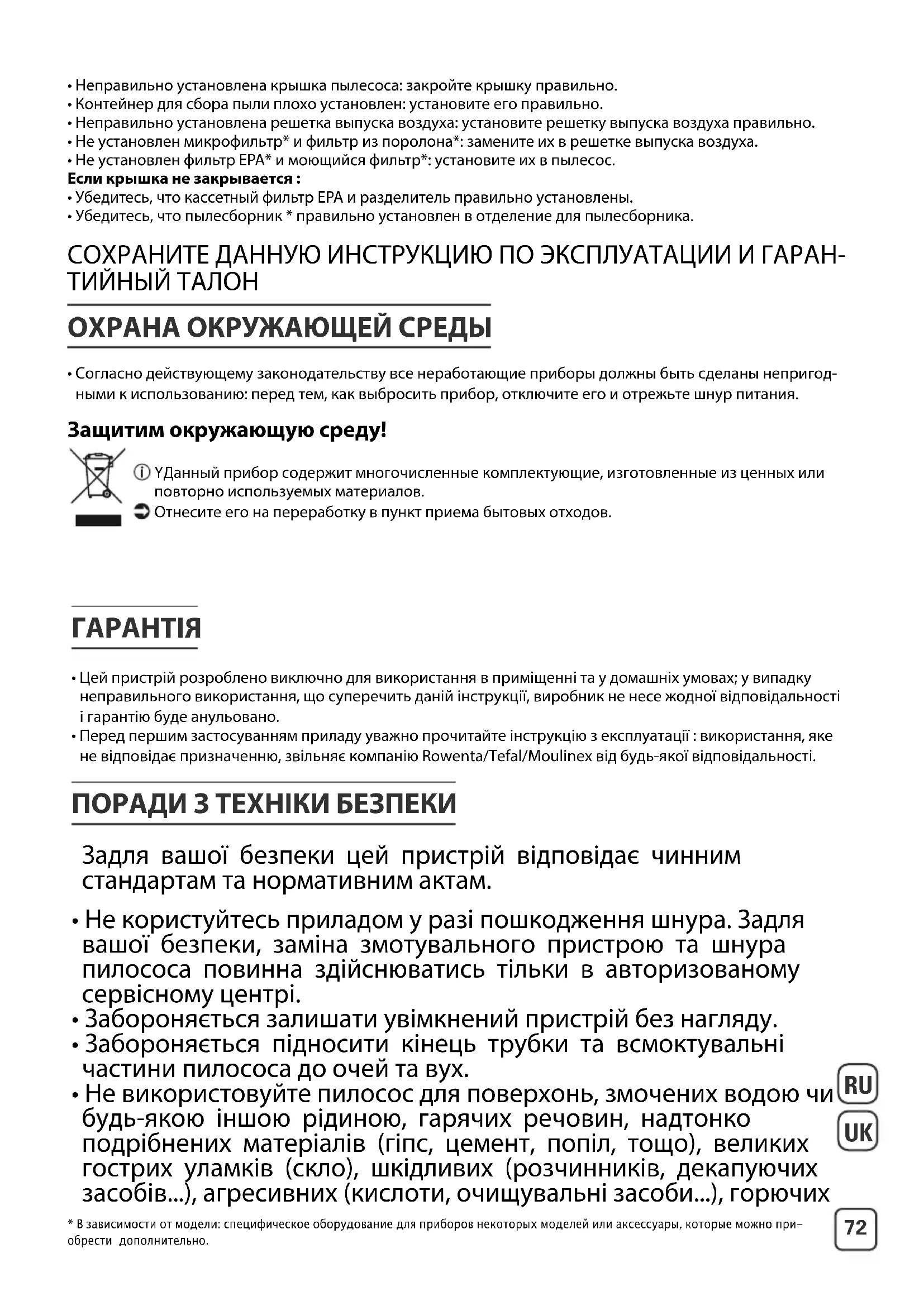 - Переконайтеся, що пилозбірник* правильно встановлено у відділенні для пилозбірника*. ПРОСИМО ЗБЕРІГАТИ ЦЮ ІНСТРУКЦІЮ ТА ГАРАНТІЙНИЙ ТАЛОН ЗАХИСТ ДОВКІЛЛЯ