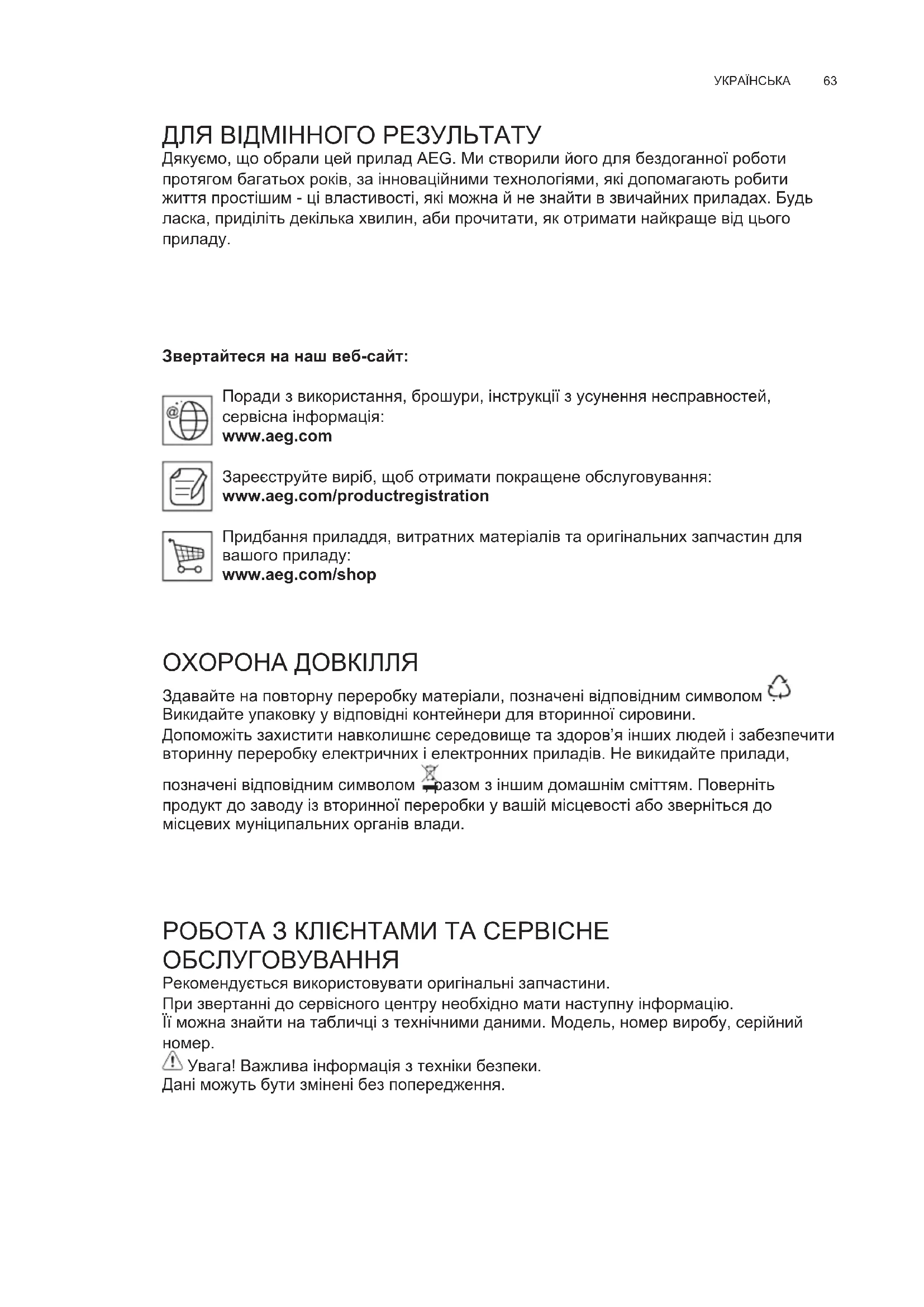 Звертайтеся на наш веб-сайт: Поради з використання, брошури, інструкції з усунення несправностей, сервісна інформація: www.aeg.com Зареєструйте виріб, щоб отримати покращене обслуговування: www.aeg.com/productregistration Придбання приладдя, витратних матеріалів та оригінальних запчастин для вашого приладу: www.aeg.com/shop ОХОРОНА ДОВКІЛЛЯ Здавайте на повторну переробку матеріали, позначені відповідним символом . Викидайте упаковку у відповідні контейнери для вторинної сировини. Допоможіть захистити навколишнє середовище та здоров’я інших людей і забезпечити вторинну переробку електричних і електронних приладів. Не викидайте прилади, позначені відповідним символом , разом з іншим домашнім сміттям. Поверніть продукт до заводу із вторинної переробки у вашій місцевості або зверніться до місцевих муніципальних органів влади. РОБОТА З КЛІЄНТАМИ ТА СЕРВІСНЕ ОБСЛУГОВУВАННЯ Рекомендується використовувати оригінальні запчастини. При звертанні до сервісного центру необхідно мати наступну інформацію. Її можна знайти на табличці з технічними даними. Модель, номер виробу, серійний