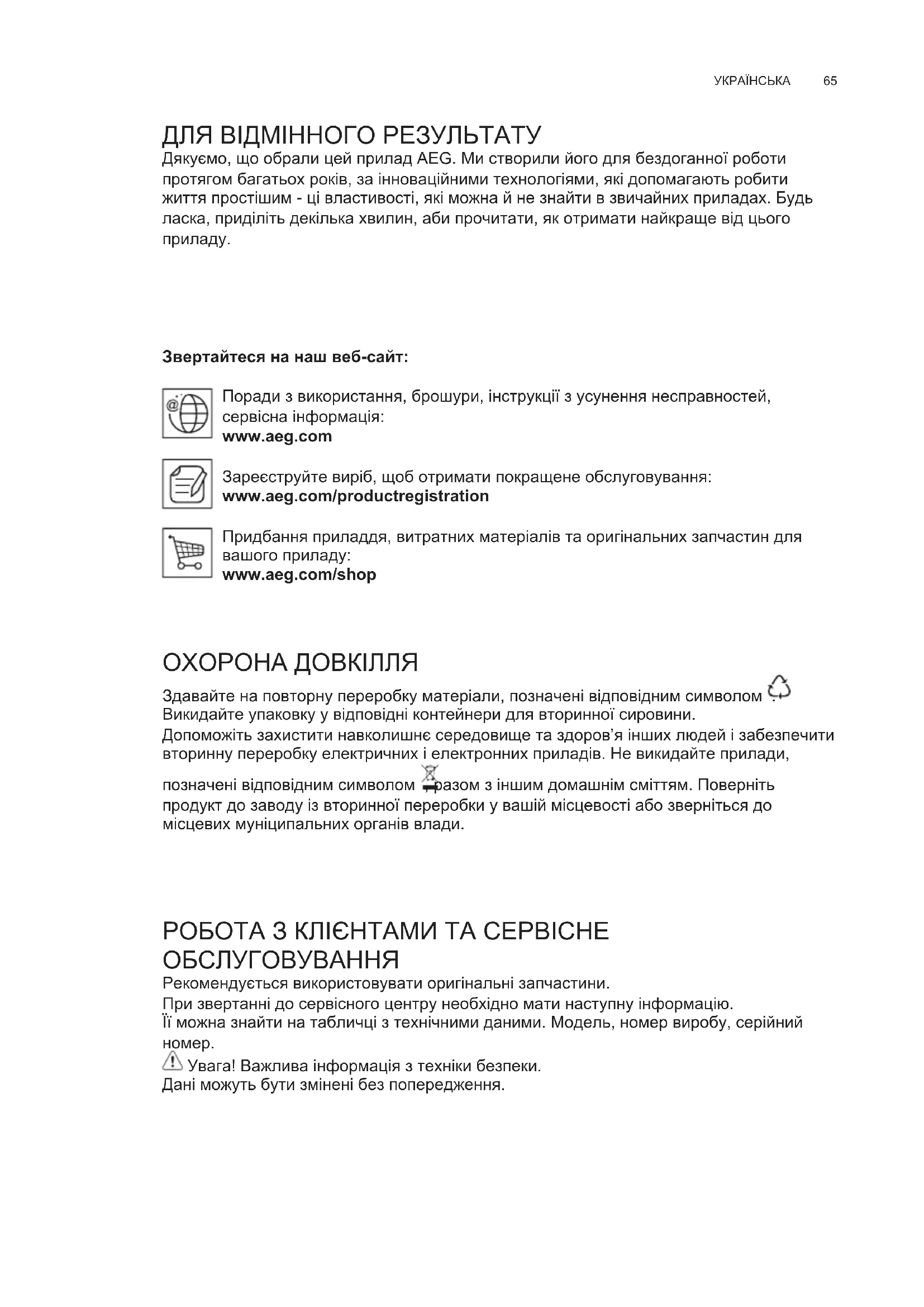Звертайтеся на наш веб-сайт: Поради з використання, брошури, інструкції з усунення несправностей, сервісна інформація: www.aeg.com Зареєструйте виріб, щоб отримати покращене обслуговування: www.aeg.com/productregistration Придбання приладдя, витратних матеріалів та оригінальних запчастин для вашого приладу: www.aeg.com/shop ОХОРОНА ДОВКІЛЛЯ Здавайте на повторну переробку матеріали, позначені відповідним символом . Викидайте упаковку у відповідні контейнери для вторинної сировини. Допоможіть захистити навколишнє середовище та здоров’я інших людей і забезпечити вторинну переробку електричних і електронних приладів. Не викидайте прилади, позначені відповідним символом , разом з іншим домашнім сміттям. Поверніть продукт до заводу із вторинної переробки у вашій місцевості або зверніться до місцевих муніципальних органів влади. РОБОТА З КЛІЄНТАМИ ТА СЕРВІСНЕ ОБСЛУГОВУВАННЯ Рекомендується використовувати оригінальні запчастини. При звертанні до сервісного центру необхідно мати наступну інформацію. Її можна знайти на табличці з технічними даними. Модель, номер виробу, серійний