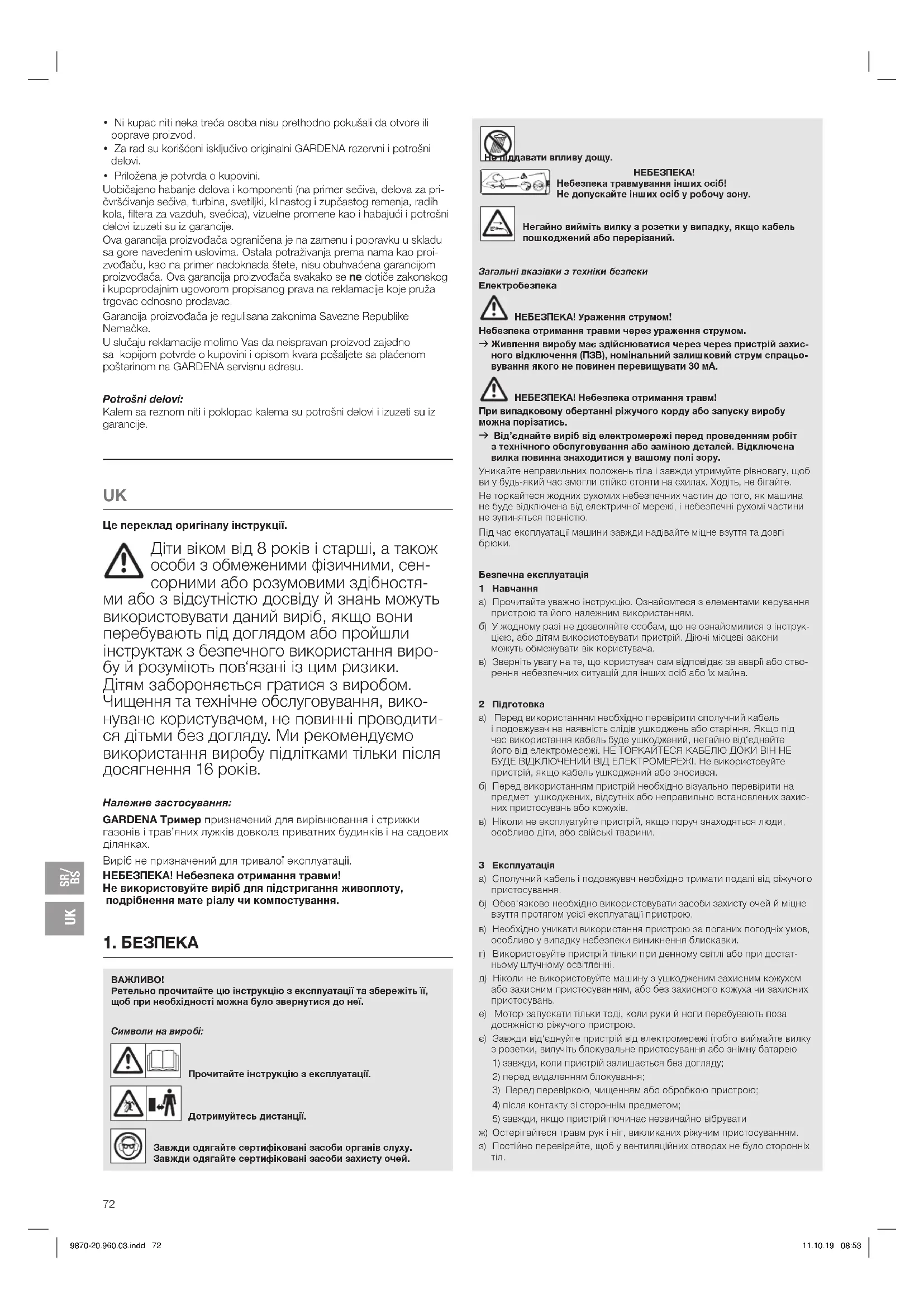 Це переклад оригіналу інструкції. Діти віком від 8 років і старші, а також особи з обмеженими фізичними, сен- сорними або розумовими здібностя- миабо з відсутністю досвіду й знань можуть використовувати даний виріб, якщо вони перебувають під доглядом або пройшли інструктаж з безпечного використання виро- бу й розуміють пов‘язані із цим ризики. Дітям забороняється гратися з виробом. Чищення та технічне обслуговування, вико- нуване користувачем, не повинні проводити- ся дітьми без догляду. Ми рекомендуємо використання виробу підлітками тільки після досягнення 16 років. Належне застосування: GARDENA Тример призначений для вирівнювання і стрижки газонів і трав’яних лужків довкола приватних будинків і на садових