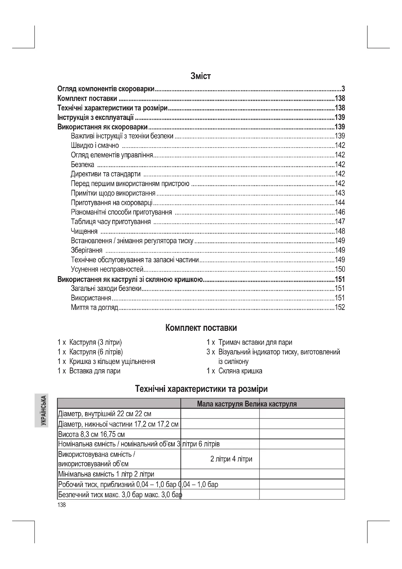 - Миття та догляд Комплект поставки Технічні характеристики та розміри Мала каструля Велика каструля Діаметр, внутрішній 22 см 22 см Діаметр, нижньої частини 17,2 см 17,2 см Висота 8,3 см 16,75 см Номінальна ємність / номінальний об’єм 3 літри 6 літрів Використовувана ємність / використовуваний об’єм 2 літри 4 літри Мінімальна ємність 1 літр 2 літри Робочий тиск, приблизний 0,04 – 1,0 бар 0,04 – 1,0 бар Безпечний тиск макc. 3,0 бар макс. 3,0 бар 1 x Каструля (3 літри) 1 x Каструля (6 літрів) 1 x Кришка з кільцем ущільнення 1 x Вставка для пари 1 x Тримач вставки для пари 3 x Візуальний індикатор тиску, виготовлений із силікону 1 x Скляна кришка139 ČESKY ČESKY ENGLISH ENGLISH Інструкція з експлуатації Дякуємо за вибір нашої продукції. Сподіваємося, ви будете задоволені. Символи в цій інструкції з експлуатації Важливі вказівки для Вашої безпеки спеціально відмічені. Для запобігання нещасних випадків та пошкоджень приладу обов’язково притримуйтесь цих вказівок: ПОПЕРЕДЖЕННЯ. Попереджує про загрози для Вашого здоров’я та вказує на можливі ризики травм. p. 152