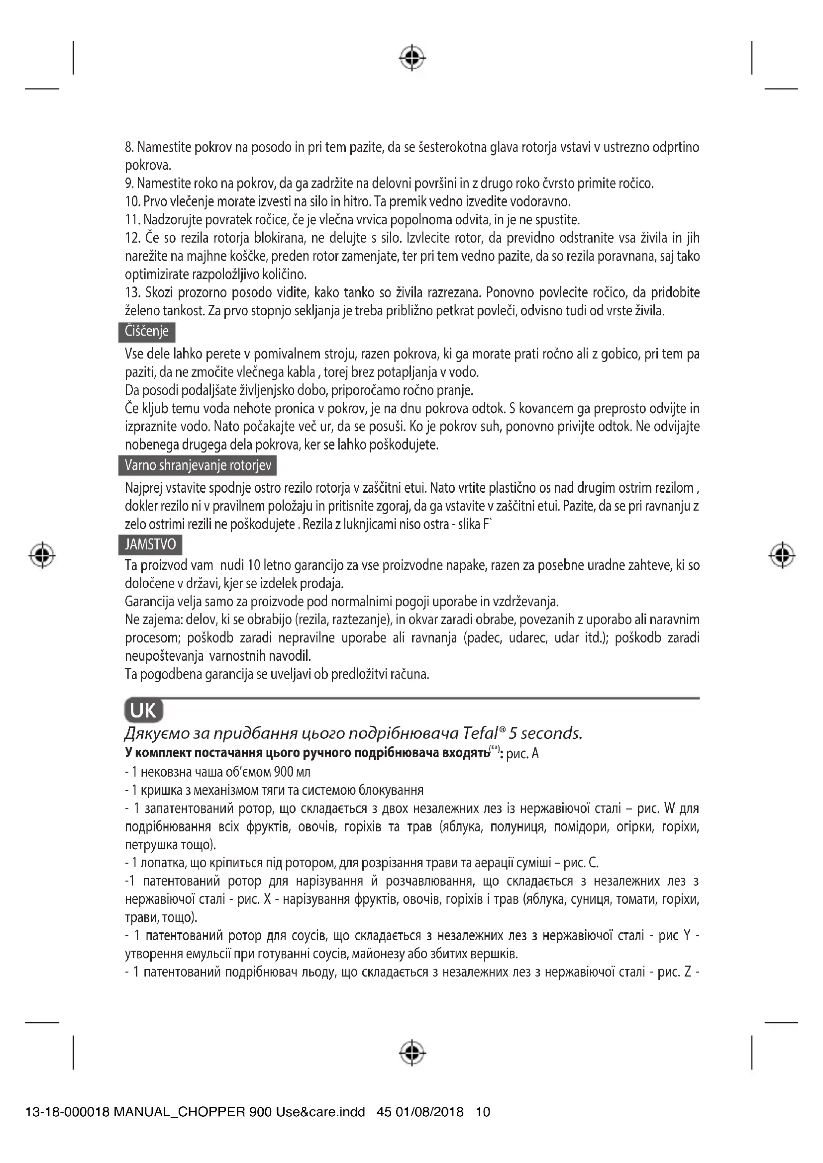 - 1 нековзна чаша об’ємом 900 мл - 1 кришка з механізмом тяги та системою блокування - 1 запатентований ротор, що складається з двох незалежних лез із нержавіючої сталі – рис. W для подрібнювання всіх фруктів, овочів, горіхів та трав (яблука, полуниця, помідори, огірки, горіхи, петрушка тощо). - 1 лопатка, що кріпиться під ротором, для розрізання трави та аерації суміші – рис. C. -1 патентований ротор для нарізування й розчавлювання, що складається з незалежних лез з нержавіючої сталі - рис. Х - нарізування фруктів, овочів, горіхів і трав (яблука, суниця, томати, горіхи, трави, тощо). - 1 патентований ротор для соусів, що складається з незалежних лез з нержавіючої сталі - рис Y - утворення емульсії при готуванні соусів, майонезу або збитих вершків. - 1 патентований подрібнювач льоду, що складається з незалежних лез з нержавіючої сталі - рис. Z - CST-13-18-000018 MANUAL_CHOPPER 900 Use&care.indd 45 01/08/2018 10:57подрібнення льоду для коктейлів. ** : Загальний перелік, кількість і тип лез можуть відрізнятись залежно від вибраного набору. Запобіжні заходи під час використання Щоб забезпечити оптимальні результати, заповнюйте чашу наполовину, попередньо порізавши інгредієнти на шматки та очистивши їх від шкірки. Не використовуйте м’ясо з кістками, ви назавжди пошкодите леза. Інструкції з техніки безпеки Ці леза слід використовувати лише з ПОДРІБНЮВАЧЕМ TEFAL® 5 SECONDS 900 мл. Цей пристрій не дозволяється використовувати дітям або особам з інвалідністю, яка перешкоджає безпечному використанню. Цей пристрій не є іграшкою. Зберігайте його в недосяжному для дітей місці. Використовуйте цей пристрій на стійкій і сухій робочій поверхні. Уникайте наповнення чаші більш ніж на половину від її загального об’єму. – рис. B Закриваючи чашу, переконайтеся, що вона заблокована Леза з високоякісної нержавіючої сталі надзвичайно гострі. Вживайте всіх необхідних запобіжних заходів, щоб захистити пальці, коли берете леза руками. Рекомендується використовувати