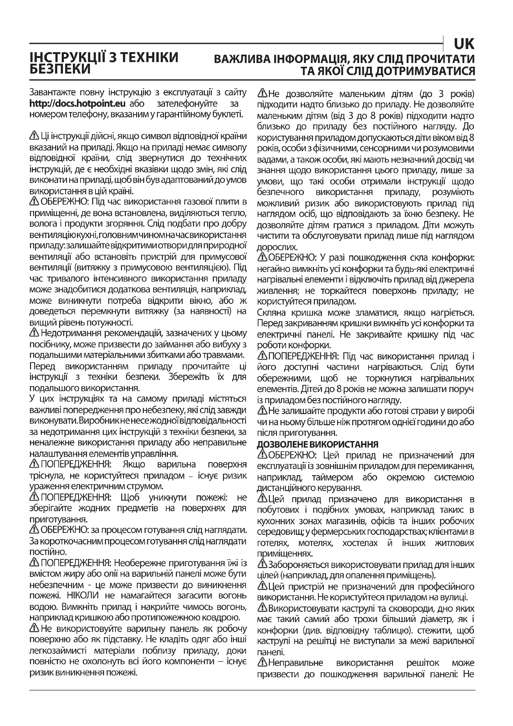 Manual de utilizare ROЗавантажте повну інструкцію з експлуатації з сайту http://docs.hotpoint.eu або зателефонуйте за номером телефону, вказаним у гарантійному буклеті. Ці інструкції дійсні, якщо символ відповідної країни вказаний на приладі. Якщо на приладі немає символу відповідної країни, слід звернутися до технічних інструкцій, де є необхідні вказівки щодо змін, які слід виконати на приладі, щоб він був адаптований до умов використання в цій країні. ОБЕРЕЖНО: Під час використання газової плити в приміщенні, де вона встановлена, виділяються тепло, волога і продукти згоряння. Слід подбати про добру вентиляцію кухні, головним чином на час використання приладу: залишайте відкритими отвори для природної вентиляції або встановіть пристрій для примусової вентиляції (витяжку з примусовою вентиляцією). Під час тривалого інтенсивного використання приладу може знадобитися додаткова вентиляція, наприклад, може виникнути потреба відкрити вікно, або ж доведеться перемкнути витяжку (за наявності) на вищий рівень потужності. Недотримання рекомендацій, зазначених у цьому посібнику, може призвести до займання або вибуху з подальшими матеріальними збитками або травмами. Перед використанням приладу прочитайте ці інструкції з техніки безпеки. Збережіть їх для подальшого використання. У цих інструкціях та на самому приладі містяться важливі попередження про небезпеку, які слід завжди виконувати. Виробник не несе жодної відповідальності за недотримання цих інструкцій з техніки безпеки, за неналежне використання приладу або неправильне налаштування елементів управління. ПОПЕРЕДЖЕННЯ: Якщо варильна поверхня тріснула, не користуйтеся приладом − існує ризик ураження електричним струмом. ПОПЕРЕДЖЕННЯ: Щоб уникнути пожежі: не зберігайте жодних предметів на поверхнях для приготування. ОБЕРЕЖНО: за процесом готування слід наглядати. За короткочасним процесом готування слід наглядати