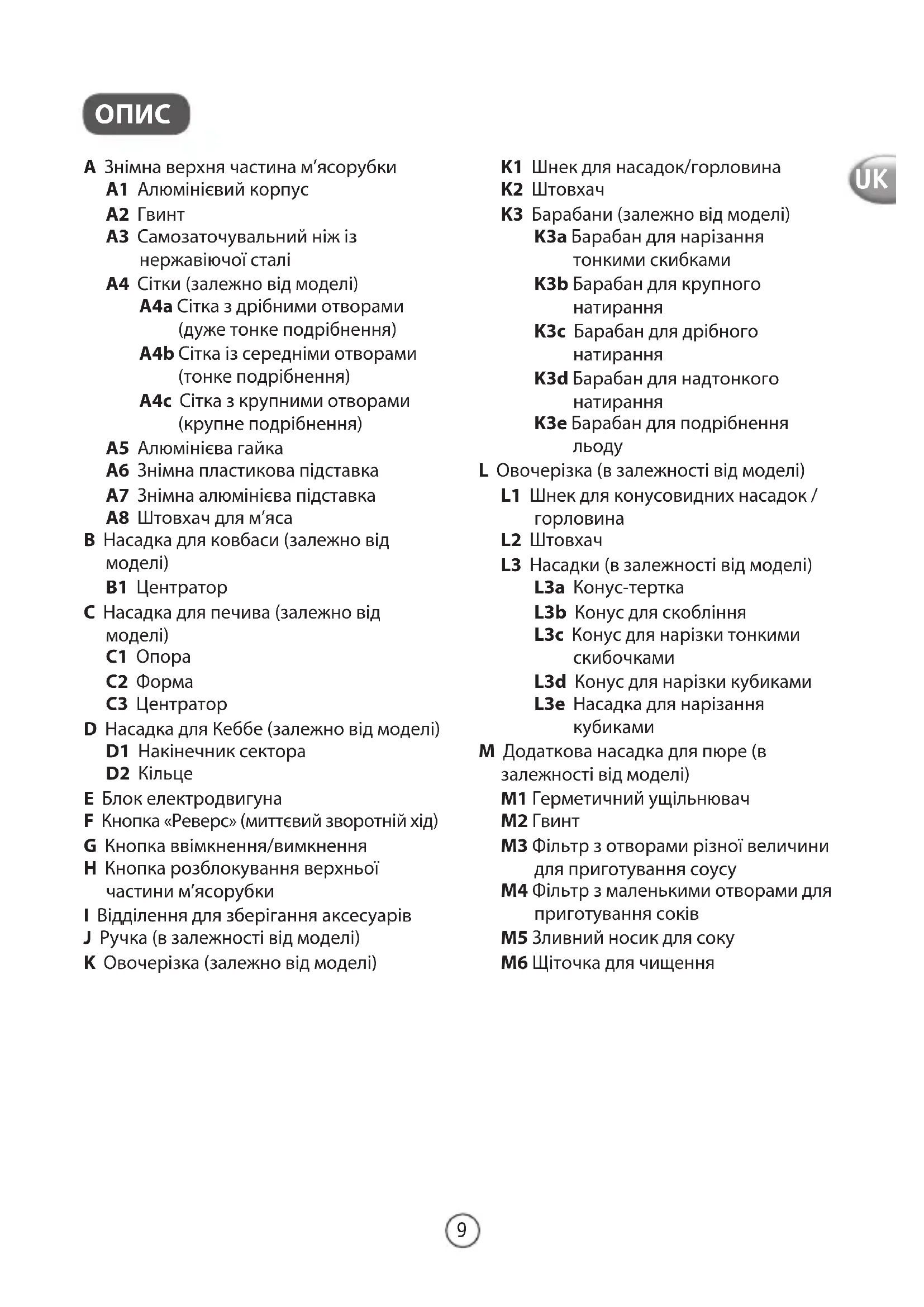 C1 Опора C2 Форма C3 Центратор D Насадка для Кеббе (залежно від моделі) D1 Накінечник сектора D2 Кільце E Блок електродвигуна F Кнопка «Реверс» (миттєвий зворотній хід) G Кнопка ввімкнення/вимкнення H Кнопка розблокування верхньої частини м’ясорубки I Відділення для зберігання аксесуарів J Ручка (в залежності від моделі) K Овочерізка (залежно від моделі) K1 Шнек для насадок/горловина K2 Штовхач K3 Барабани (залежно від моделі) K3a Барабан для нарізання тонкими скибками K3b Барабан для крупного