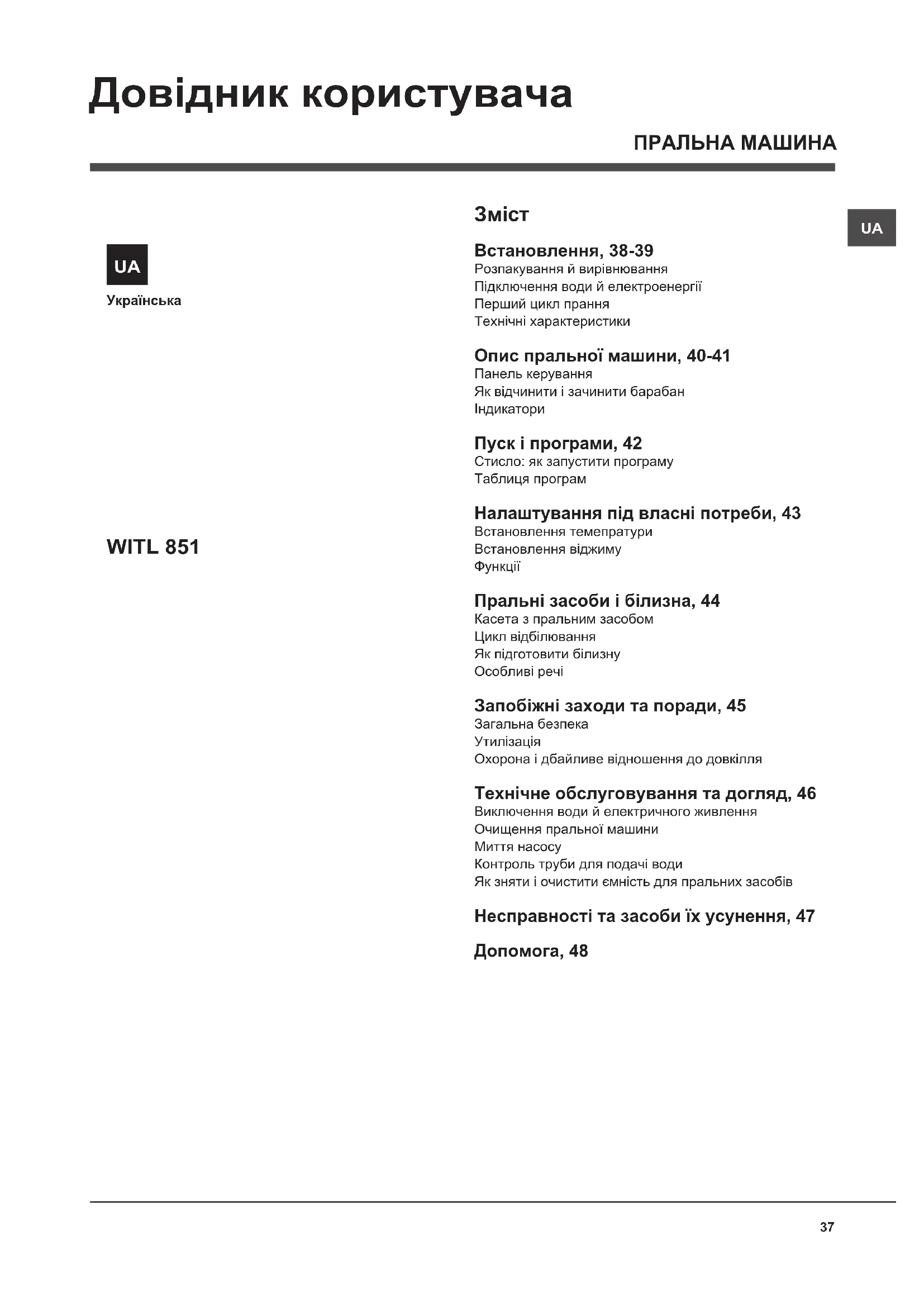 Змiст Встановлення, 38-39 Розпакування й вирівнювання Підключення води й електроенергії Перший цикл прання Технiчнi характеристики Опис пральної машини, 40-41 Панель керування Як відчинити і зачинити барабан Iндикатори Пуск і програми, 42 Стисло: як запустити програму Таблиця програм Налаштування під власні потреби, 43 Встановлення темепратури Встановлення вiджиму Функцiї Пральні засоби і білизна, 44 Касета з пральним засобом Цикл відбілювання Як підготовити білизну Особливi речi Запобіжні заходи та поради, 45 Загальна безпека Утилiзацiя Охорона і дбайливе відношення до довкілля Технічне обслуговування та догляд, 46 Виключення води й електричного живлення Очищення пральної машини Миття насосу Контроль труби для подачі води Як зняти і очистити ємність для пральних засобів Несправності та засоби їх усунення, 47 Допомога, 48