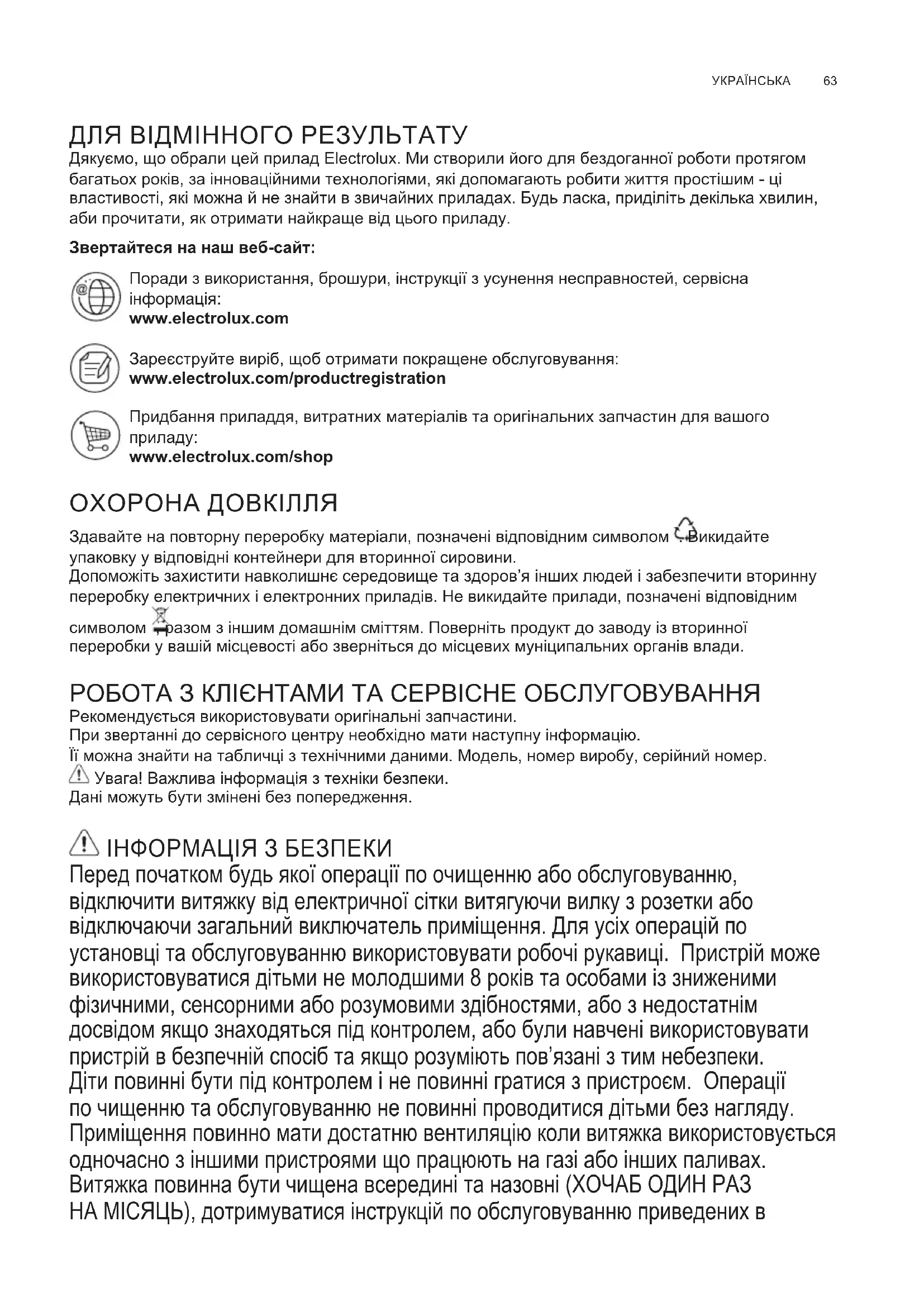 www.electrolux.com/shop ОХОРОНА ДОВКІЛЛЯ Здавайте на повторну переробку матеріали, позначені відповідним символом . Викидайте упаковку у відповідні контейнери для вторинної сировини. Допоможіть захистити навколишнє середовище та здоров’я інших людей і забезпечити вторинну переробку електричних і електронних приладів. Не викидайте прилади, позначені відповідним символом , разом з іншим домашнім сміттям. Поверніть продукт до заводу із вторинної переробки у вашій місцевості або зверніться до місцевих муніципальних органів влади. РОБОТА З КЛІЄНТАМИ ТА СЕРВІСНЕ ОБСЛУГОВУВАННЯ Рекомендується використовувати оригінальні запчастини. При звертанні до сервісного центру необхідно мати наступну інформацію. Її можна знайти на табличці з технічними даними. Модель, номер виробу, серійний номер. Увага! Важлива інформація з техніки безпеки. Дані можуть бути змінені без попередження. ІНФОРМАЦІЯ З БЕЗПЕКИ Перед початком будь якої операції по очищенню або обслуговуванню, відключити витяжку від електричної сітки витягуючи вилку з розетки або відключаючи загальний виключатель приміщення. Для усіх операцій по установці та обслуговуванню використовувати робочі рукавиці. Пристрій може використовуватися дітьми не молодшими 8 років та особами із зниженими фізичними, сенсорними або розумовими здібностями, або з недостатнім досвідом якщо знаходяться під контролем, або були навчені використовувати пристрій в безпечній спосіб та якщо розуміють пов’язані з тим небезпеки. Діти повинні бути під контролем і не повинні гратися з пристроєм. Операції по чищенню та обслуговуванню не повинні проводитися дітьми без нагляду. Приміщення повинно мати достатню вентиляцію коли витяжка використовується одночасно з іншими пристроями що працюють на газі або інших паливах. Витяжка повинна бути чищена всередині та назовні (ХОЧАБ ОДИН РАЗ НА МІСЯЦЬ), дотримуватися інструкцій по обслуговуванню приведених в UK ІНСТРУКЦІЯ З ЕКСПЛУАТАЦІЇwww.electrolux.com64 цьому посібнику. Не дотримання норм чищення витяжки та заміни і чищення фільтрів може привести до загорання. Суворо заборонено приготування їди на відкритому вогні під витяжкою. Використання відкритого полум’я наносить збиток фільтрам і може призвести до загорання, тому потрібно уникати в будь якому випадку. Жарення повинно проводитися під наглядом щоб уникнути що розігріта олія загориться. Увага! Коли поверхня варіння працює доступні частини можуть нагріватися. Для заміни лампочки освітлення використовувати тільки тип лампочки вказаний в розділі обслуговування/заміна лампочки цього посібника. Увага! Не підключати пристрій до електричної сітки до тих пір, поки не буде повністю закінчена установка. При під’єднанні витяжки до електричної мережі дозволяється використовувати лише сертифіковані електричні адаптери, і в жодному разі не подовжувачі.