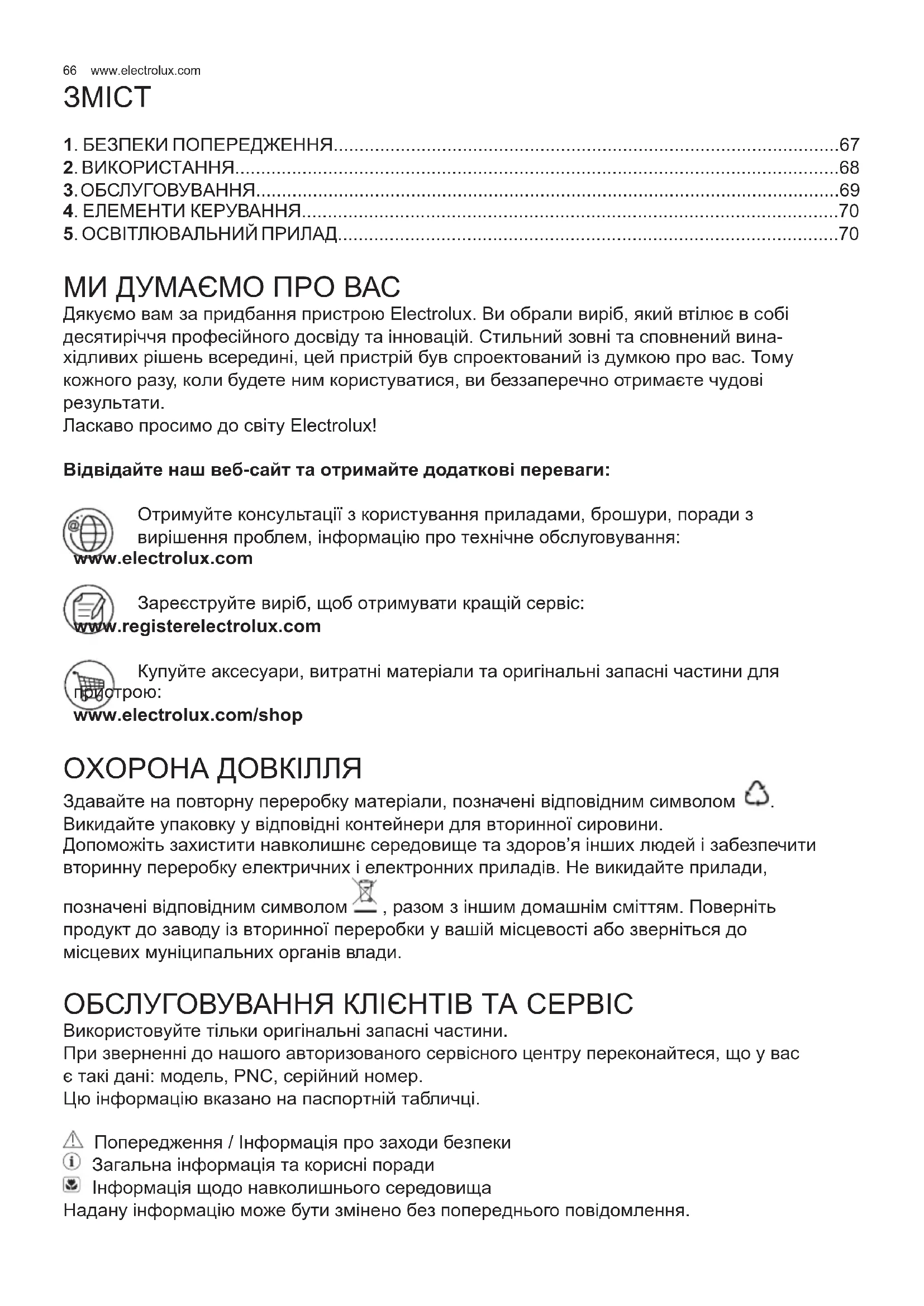 www.electrolux.com/shop ОХОРОНА ДОВКІЛЛЯ Здавайте на повторну переробку матеріали, позначені відповідним символом . Викидайте упаковку у відповідні контейнери для вторинної сировини. Допоможіть захистити навколишнє середовище та здоров’я інших людей і забезпечити вторинну переробку електричних і електронних приладів. Не викидайте прилади, позначені відповідним символом , разом з іншим домашнім сміттям. Поверніть продукт до заводу із вторинної переробки у вашій місцевості або зверніться до місцевих муніципальних органів влади. ОБСЛУГОВУВАННЯ КЛІЄНТІВ ТА СЕРВІС Використовуйте тільки оригінальні запасні частини. При зверненні до нашого авторизованого сервісного центру переконайтеся, що у вас є такі дані: модель, PNC, серійний номер. Цю інформацію вказано на паспортній табличці. Попередження / Інформація про заходи безпеки Загальна інформація та корисні поради Інформація щодо навколишнього середовища Надану інформацію може бути змінено без попереднього повідомлення.67