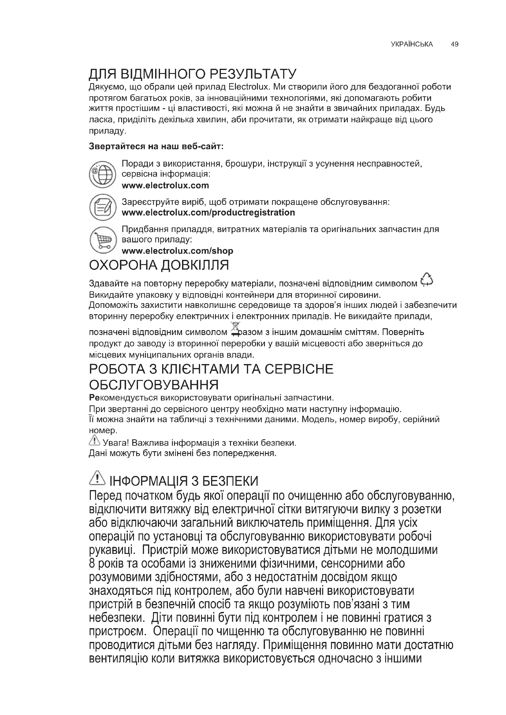 Увага! Важлива інформація з техніки безпеки. Дані можуть бути змінені без попередження. ІНФОРМАЦІЯ З БЕЗПЕКИ Перед початком будь якої операції по очищенню або обслуговуванню, відключити витяжку від електричної сітки витягуючи вилку з розетки або відключаючи загальний виключатель приміщення. Для усіх операцій по установці та обслуговуванню використовувати робочі рукавиці. Пристрій може використовуватися дітьми не молодшими 8 років та особами із зниженими фізичними, сенсорними або розумовими здібностями, або з недостатнім досвідом якщо знаходяться під контролем, або були навчені використовувати пристрій в безпечній спосіб та якщо розуміють пов’язані з тим небезпеки. Діти повинні бути під контролем і не повинні гратися з пристроєм. Операції по чищенню та обслуговуванню не повинні проводитися дітьми без нагляду. Приміщення повинно мати достатню вентиляцію коли витяжка використовується одночасно з іншими UK ІНСТРУКЦІЯ З ЕКСПЛУАТАЦІЇwww.electrolux.com50 пристроями що працюють на газі або інших паливах. Витяжка повинна бути чищена всередині та назовні (ХОЧАБ ОДИН РАЗ НА МІСЯЦЬ), дотримуватися інструкцій по обслуговуванню приведених в цьому посібнику. Не дотримання норм чищення витяжки та заміни і чищення фільтрів може привести до загорання. Суворо заборонено приготування їди на відкритому вогні під витяжкою. кваліфікованим персоналом. УВАГА! Не встановлювання відповідних гвинтів і пристроїв для фіксування у відповідності з цими інструкціями може привести до ризиків електричного походження. 2.ВИКОРИСТАННЯ Витяжка служить для всмоктування кіптяви та пару, що утворюються під час приготування їжі. В інструкції, що додається вказується, в якому виконанні можна використовувати вашу модель - як витяжку з виведенням назовні або як витяжку з внутрішньою рециркуляцією повітря 3.ІНСТАЛЯЦІЯ Напруга в електромережі має відповідати вказаним характеристикам на етикетці, яка знаходиться всередині витяжки. Якщо в комплект входить вилка під’єднання в електромережу, то слід під’єднати витяжку до розетки, що відповідає існуючим нормам та знаходиться в доступному місці, що можна виконати й після інсталяції. Якщо ж вилка не входить в комплект (пряме під’єднання в електромережу), або розетка не знаходиться в доступному місці, також і після інсталяції, то слід вмонтувати належний двох-полюсний вимикач, який забезпечить повне відключення від мережі в умовах перенапруги III категорії, в повній відповідності з правилами інсталяції. Увага!перед тим як знову підключити витяжку до електромережі і перевірити правильність роботи, завжди контролюйте щоб шнур мережі був змонтований вірно.