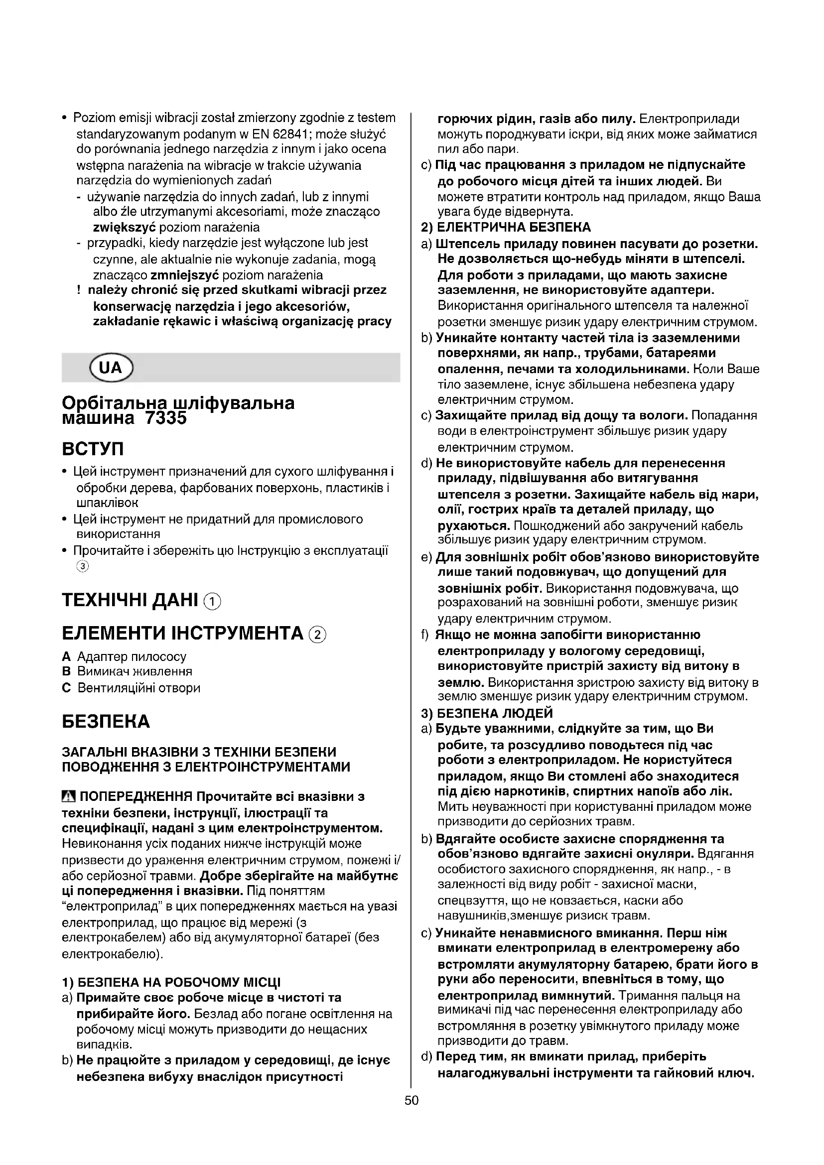 ТЕХНІЧНІ ДАНІ 1 ЕЛЕМЕНТИ ІНСТРУМЕНТА 2 A Aдаптер пилососy B Вимикач живлення C Вентиляційні отвори