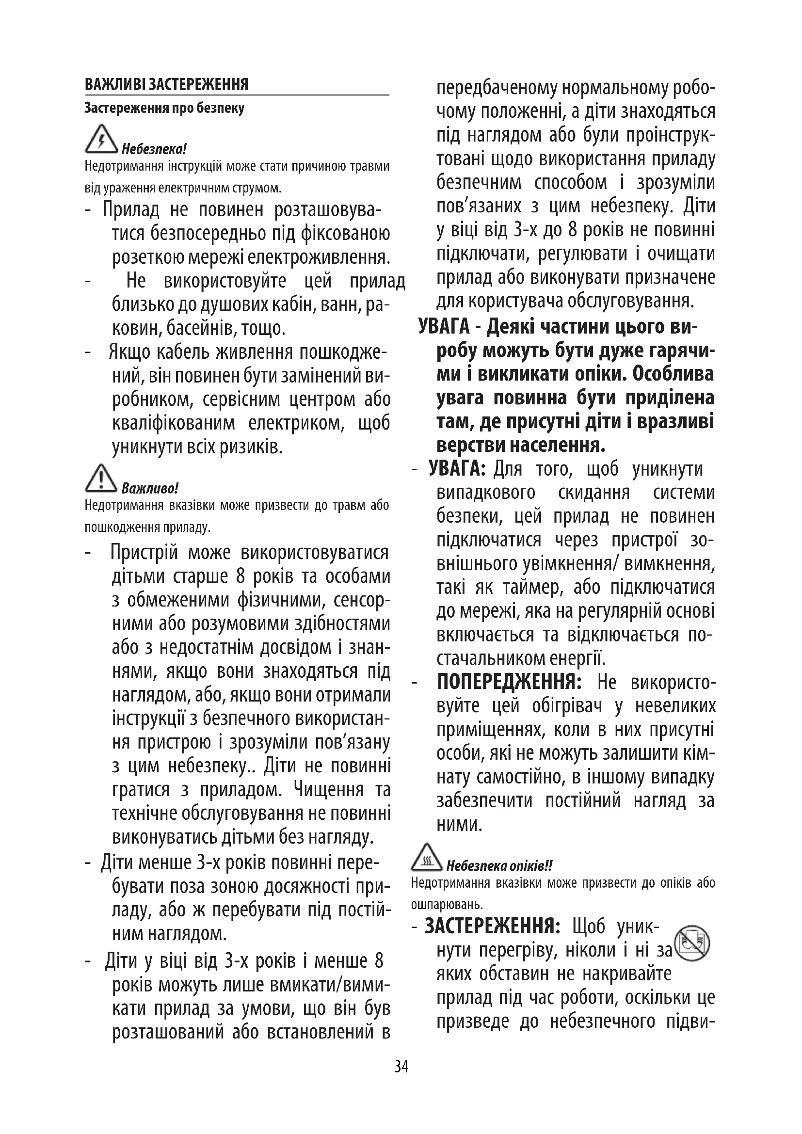 Недотримання вказівки може призвести до травм або пошкодження приладу. - Пристрій може використовуватися дітьми старше 8 років та особами з обмеженими фізичними, сенсор- ними або розумовими здібностями або з недостатнім досвідом і знан- нями, якщо вони знаходяться під наглядом, або, якщо вони отримали інструкції з безпечного використан- ня пристрою і зрозуміли пов’язану з цим небезпеку.. Діти не повинні гратися з приладом. Чищення та технічне обслуговування не повинні виконуватись дітьми без нагляду. - Діти менше 3-х років повинні пере- бувати поза зоною досяжності при- ладу, або ж перебувати під постій- ним наглядом. - Діти у віці від 3-х років і менше 8 років можуть лише вмикати/вими- кати прилад за умови, що він був розташований або встановлений в передбаченому нормальному робо- чому положенні, а діти знаходяться під наглядом або були проінструк- товані щодо використання приладу безпечним способом і зрозуміли пов’язаних з цим небезпеку. Діти у віці від 3-х до 8 років не повинні підключати, регулювати і очищати прилад або виконувати призначене для користувача обслуговування. УВАГА - Деякі частини цього ви- робу можуть бути дуже гарячи- ми і викликати опіки. Особлива увага повинна бути приділена там, де присутні діти і вразливі верстви населення. - УВАГА: Для того, щоб уникнути випадкового скидання системи безпеки, цей прилад не повинен підключатися через пристрої зо- внішнього увімкнення/ вимкнення, такі як таймер, або підключатися до мережі, яка на регулярній основі включається та відключається по- стачальником енергії. - ПОПЕРЕДЖЕННЯ: Не використо- вуйте цей обігрівач у невеликих приміщеннях, коли в них присутні особи, які не можуть залишити кім- нату самостійно, в іншому випадку забезпечити постійний нагляд за