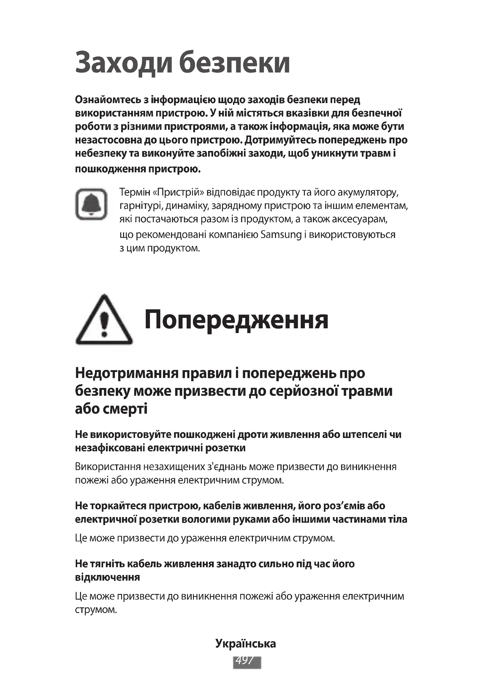 Заходи безпеки Ознайомтесь з інформацією щодо заходів безпеки перед використанням пристрою. У ній містяться вказівки для безпечної роботи з різними пристроями, а також інформація, яка може бути незастосовна до цього пристрою. Дотримуйтесь попереджень про небезпеку та виконуйте запобіжні заходи, щоб уникнути травм і пошкодження пристрою. Термін «Пристрій» відповідає продукту та його акумулятору, гарнітурі, динаміку, зарядному пристрою та іншим елементам, які постачаються разом із продуктом, а також аксесуарам, що рекомендовані компанією Samsung і використовуються з цим продуктом. Попередження Недотримання правил і попереджень про безпеку може призвести до серйозної травми