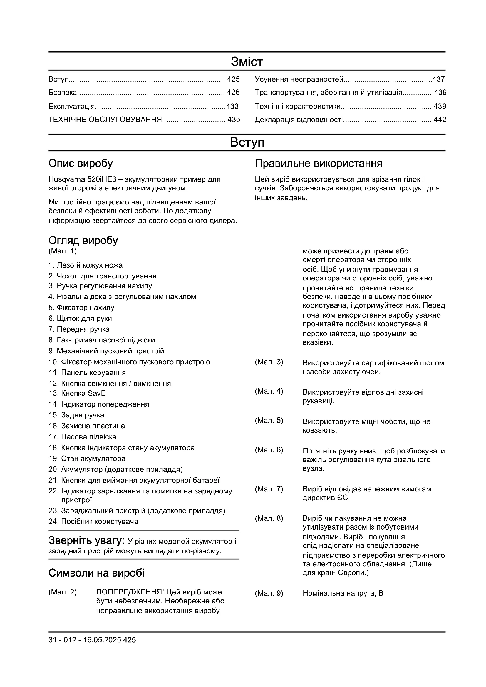 Опис виробу Husqvarna 520iHE3– акумуляторний тример для живої огорожі з електричним двигуном. Ми постійно працюємо над підвищенням вашої безпеки й ефективності роботи. По додаткову інформацію звертайтеся до свого сервісного дилера. Правильне використання Цей виріб використовується для зрізання гілок і сучків. Забороняється використовувати продукт для інших завдань. Огляд виробу (Мал. 1)