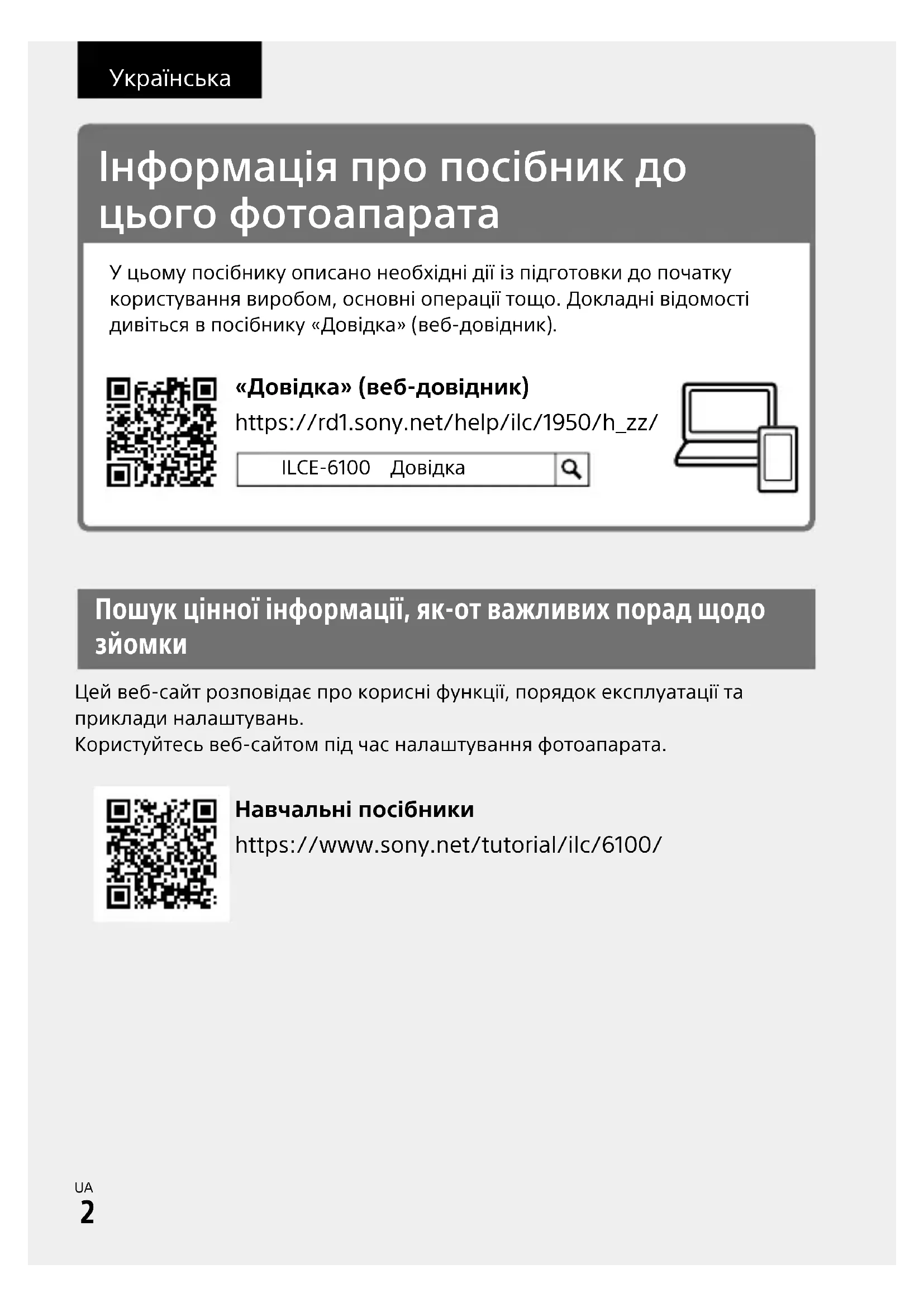 Цей веб-сайт розповідає про корисні функції, порядок експлуатації та приклади налаштувань.Користуйтесь веб-сайтом під час налаштування фотоапарата. Інформація про посібник до цього фотоапарата У цьому посібнику описано необхідні дії із підготовки до початку користування виробом, основні операції тощо. Докладні відомості дивіться в посібнику «Довідка» (веб-довідник). https://rd1.sony.net/help/ilc/1950/h_zz/ «Довідка» (веб-довідник) ILCE-6100 Довідка Навчальні посібники https://www.sony.net/tutorial/ilc/6100/ УкраїнськаILCE-61005-009-876-41(1)