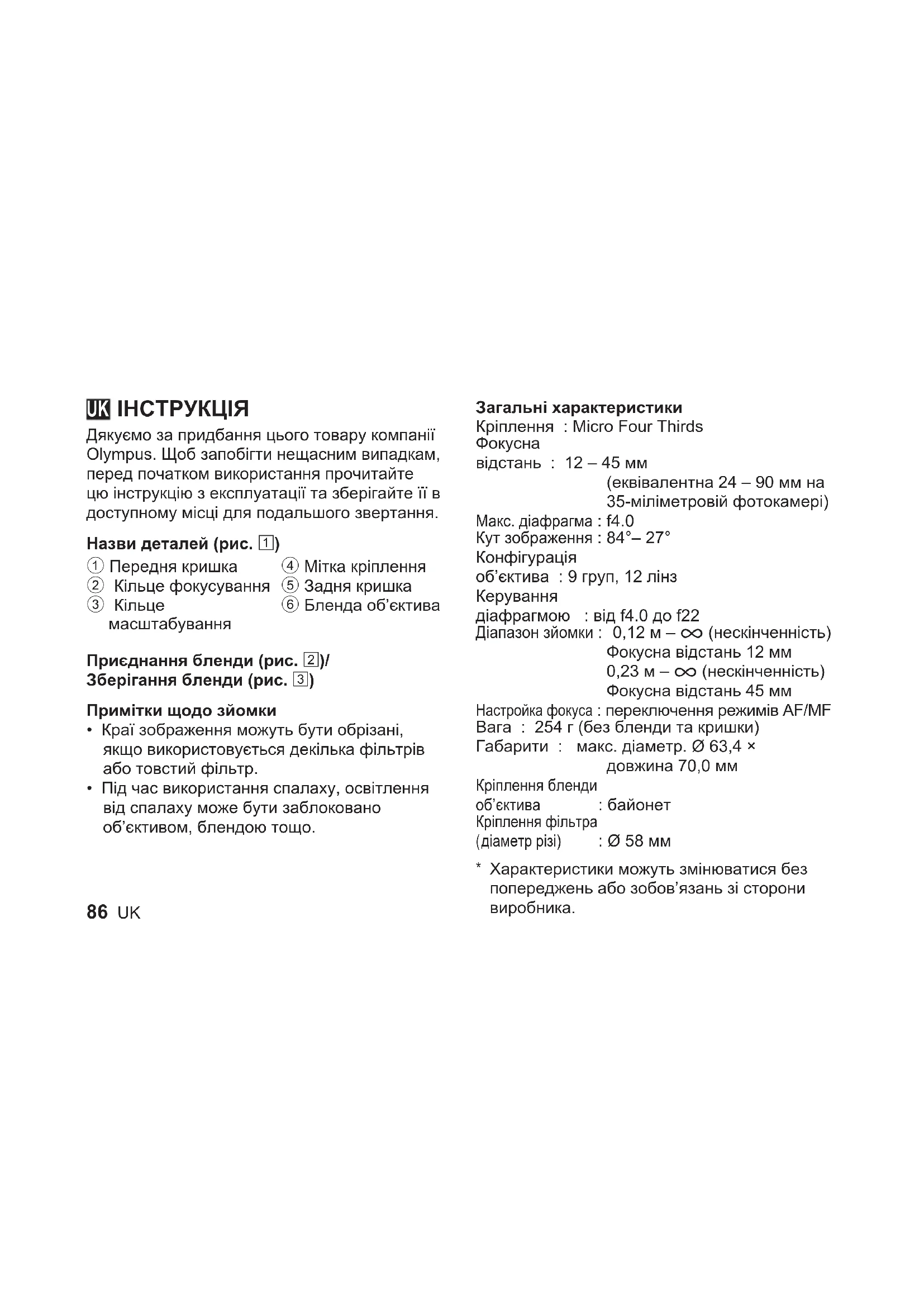 Дякуємо за придбання цього товару компанії Olympus. Щоб запобігти нещасним випадкам, перед початком використання прочитайте цю інструкцію з експлуатації та зберігайте її в доступному місці для подальшого звертання. Назви деталей (рис. 1) 1 Передня кришка 2 Кільце фокусування 3 Кільце масштабування 4 Мітка кріплення 5 Задня кришка 6 Бленда об’єктива Приєднання бленди (рис. 2)/ Зберігання бленди (рис. 3) Примітки щодо зйомки