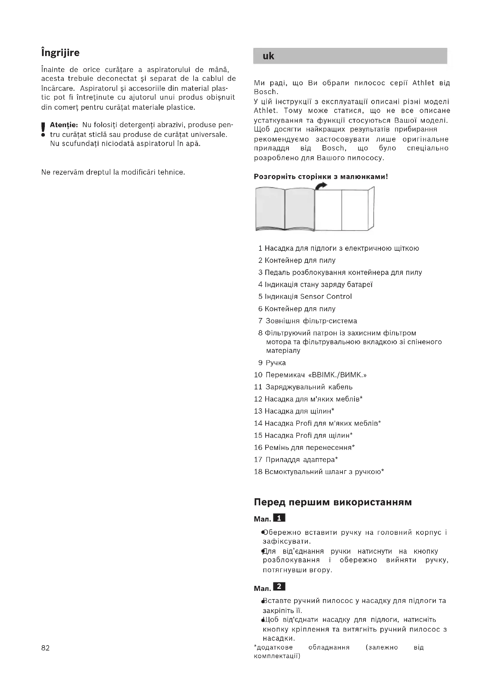 Ми раді, що Ви обрали пилосос серії Athlet від Bosch. У цій інструкції з експлуатації описані різні моделі Athlet. Тому може статися, що не все описане устаткування та функції стосуються Вашої моделі. Щоб досягти найкращих результатів прибирання рекомендуємо застосовувати лише оригінальне приладдя від Bosch, що було спеціально розроблено для Вашого пилососу. Розгорніть сторінки з малюнками! 1 Насадка для підлоги з електричною щіткою 2 Контейнер для пилу 3 Педаль розблокування контейнера для пилу 4 Індикація стану заряду батареї 5 Індикація Sensor Control 6 Контейнер для пилу 7 Зовнішня фільтр-система 8 Фільтруючий патрон iз захисним фільтром мотора та фільтрувальною вкладкою зі спіненого