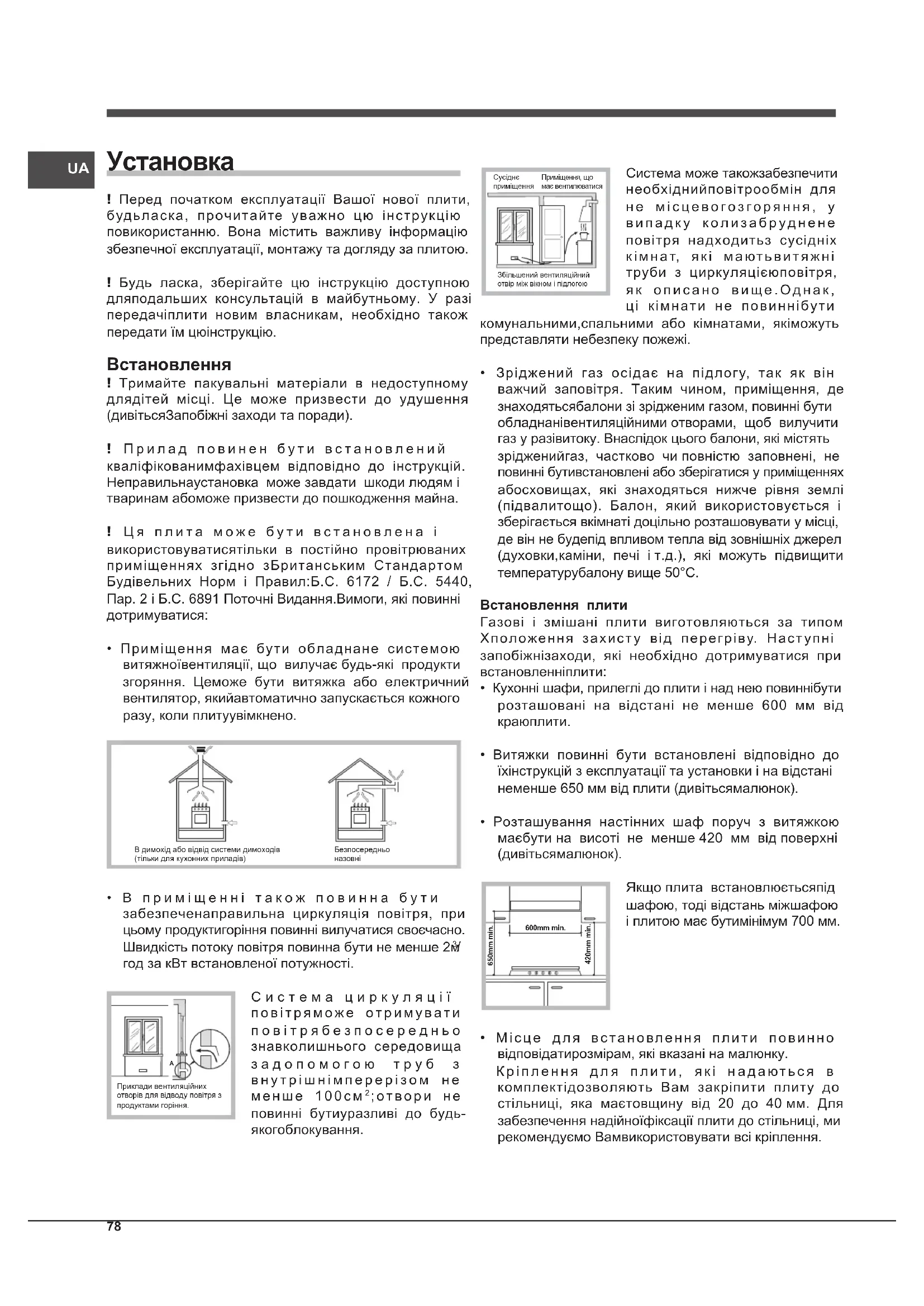! Перед початком експлуатації Вашої нової плити, будьласка, прочитайте уважно цю інструкцію повикористанню. Вона містить важливу інформацію збезпечної експлуатації, монтажу та догляду за плитою. ! Будь ласка, зберігайте цю інструкцію доступною дляподальших консультацій в майбутньому. У разі передачіплити новим власникам, необхідно також передати їм цюінструкцію. Встановлення ! Тримайте пакувальні матеріали в недоступному длядітей місці. Це може призвести до удушення (дивітьсяЗапобіжні заходи та поради). ! Прилад повинен бути встановлений кваліфікованимфахівцем відповідно до інструкцій. Неправильнаустановка може завдати шкоди людям і тваринам абоможе призвести до пошкодження майна. ! Ця плита може бути встановлена і використовуватисятільки в постійно провітрюваних приміщеннях згідно зБританським Стандартом Будівельних Норм і Правил:Б.С. 6172 / Б.С. 5440, Пар. 2 і Б.С. 6891 Поточні Видання.Вимоги, які повинні дотримуватися:
