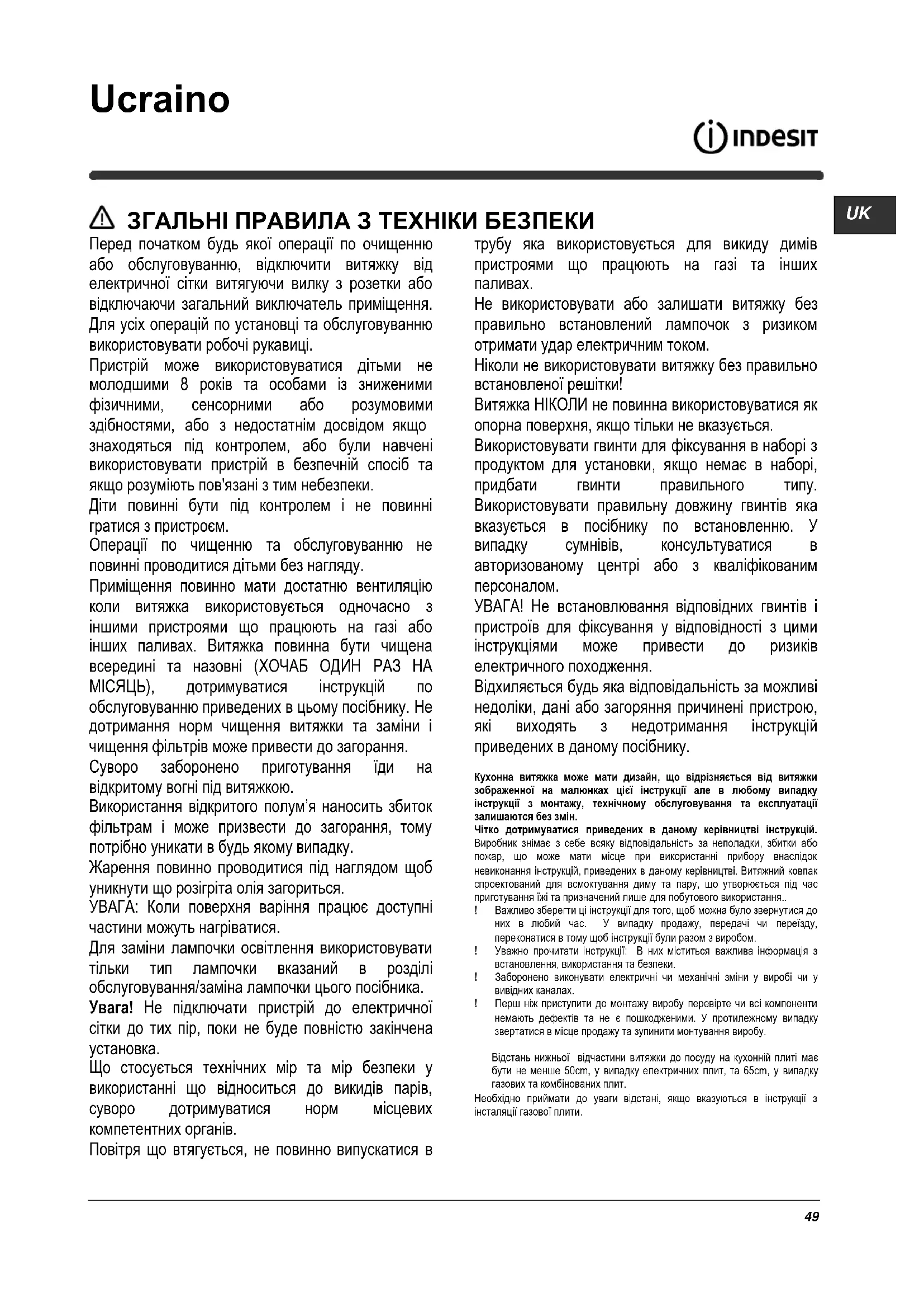 Не використовувати або залишати витяжку без правильно встановлений лампочок з ризиком отримати удар електричним током. Ніколи не використовувати витяжку без правильно встановленої решітки! Витяжка НІКОЛИ не повинна використовуватися як опорна поверхня, якщо тільки не вказується. Використовувати гвинти для фіксування в наборі з продуктом для установки, якщо немає в наборі, придбати гвинти правильного типу. Використовувати правильну довжину гвинтів яка вказується в посібнику по встановленню. У випадку сумнівів, консультуватися в авторизованому центрі або з кваліфікованим персоналом. УВАГА! Не встановлювання відповідних гвинтів і пристроїв для фіксування у відповідності з цими інструкціями може привести до ризиків електричного походження. Відхиляється будь яка відповідальність за можливі недоліки, дані або загоряння причинені пристрою, які виходять з недотримання інструкцій приведених в даному посібнику. Кухонна витяжка може мати дизайн, що відрізняється від витяжки зображенної на малюнках цієї інструкції але в любому випадку інструкції з монтажу, технічному обслуговування та експлуатації залишаются без змін. Чітко дотримуватися приведених в даному керівництві інструкцій. Виробник знімає з себе всяку відповідальність за неполадки, збитки або пожар, що може мати місце при використанні прибору внаслідок невиконання інструкцій, приведених в даному керівництві. Витяжний ковпак спроектований для всмоктування диму та пару, що утворюється під час приготування їжі та призначений лише для побутового використання.. ! Важливо зберегти ці інструкції для того, щоб можна було звернутися до них в любий час. У випадку продажу, передачі чи