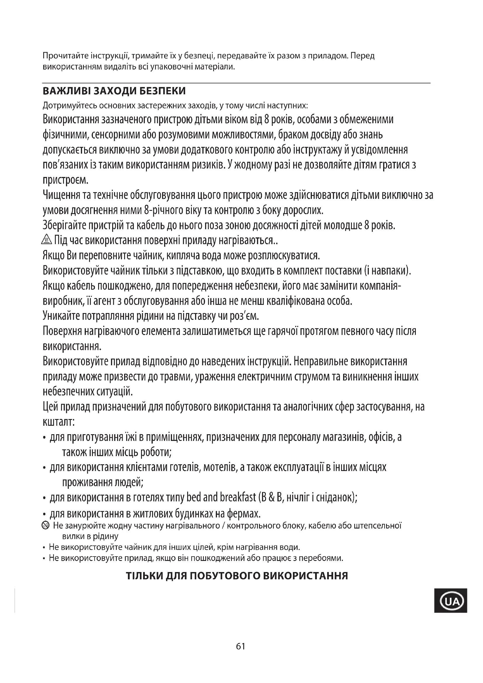 Чищення та технічне обслуговування цього пристрою може здійснюватися дітьми виключно за умови досягнення ними 8-річного віку та контролю з боку дорослих. Зберігайте пристрій та кабель до нього поза зоною досяжності дітей молодше 8 років. h Під час використання поверхні приладу нагріваються.. Якщо Ви переповните чайник, кипляча вода може розплюскуватися. Використовуйте чайник тільки з підставкою, що входить в комплект поставки (і навпаки). Якщо кабель пошкоджено, для попередження небезпеки, його має замінити компанія- виробник, її агент з обслуговування або інша не менш кваліфікована особа. Уникайте потрапляння рідини на підставку чи роз’єм. Поверхня нагріваючого елемента залишатиметься ще гарячої протягом певного часу після використання. Використовуйте прилад відповідно до наведених інструкцій. Неправильне використання приладу може призвести до травми, ураження електричним струмом та виникнення інших небезпечних ситуацій. Цей прилад призначений для побутового використання та аналогічних сфер застосування, на