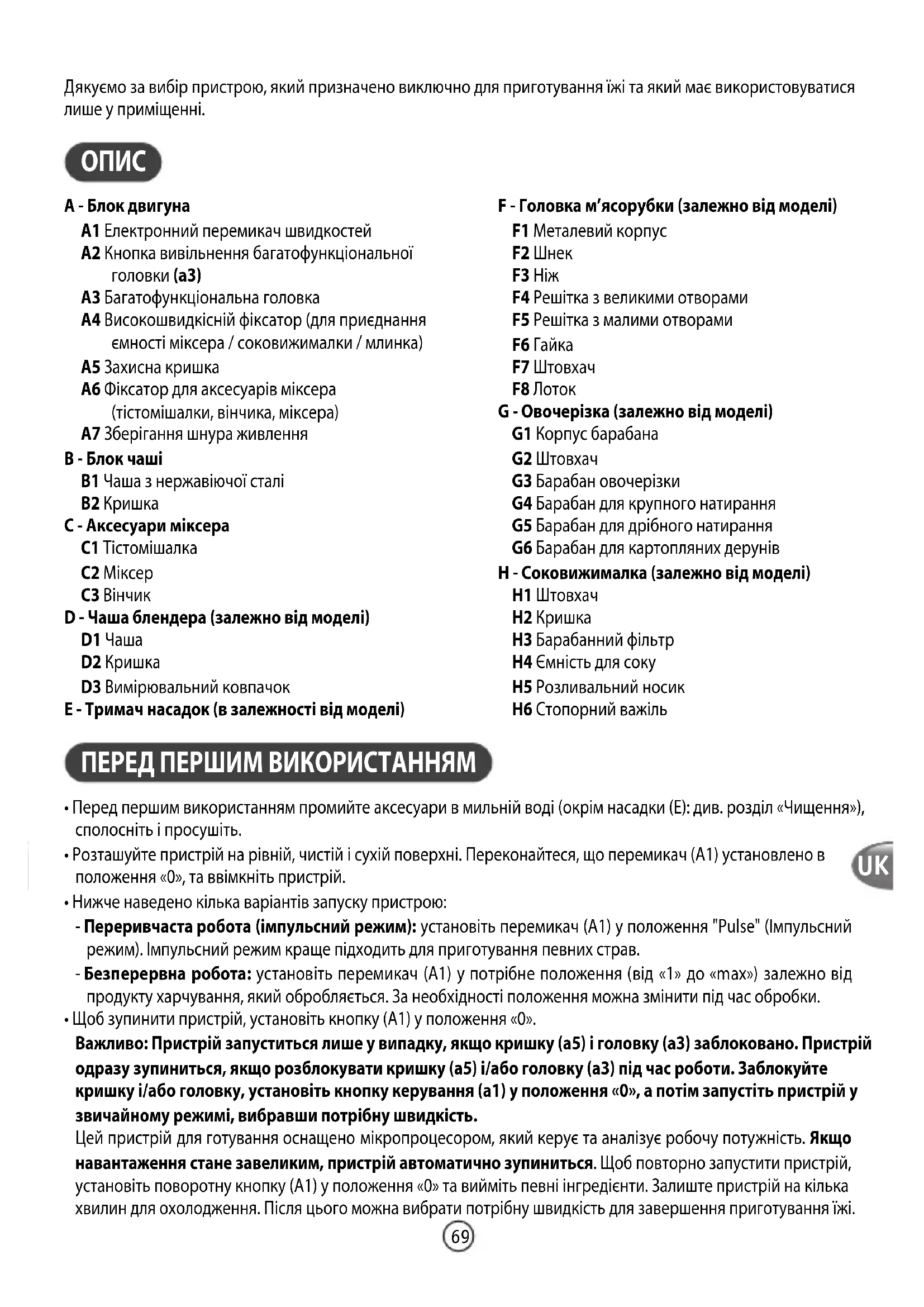 A - Блок двигуна A1 Електронний перемикач швидкостей A2 Кнопка вивільнення багатофункціональної головки (a3) A3 Багатофункціональна головка A4 Високошвидкісній фіксатор (для приєднання ємності міксера / соковижималки / млинка) A5 Захисна кришка A6 Фіксатор для аксесуарів міксера (тістомішалки, вінчика, міксера) A7 Зберігання шнура живлення B - Блок чаші B1 Чаша з нержавіючої сталі B2 Кришка C - Аксесуари міксера C1 Тістомішалка C2 Міксер C3 Вінчик D - Чаша блендера (залежно від моделі) D1 Чаша D2 Кришка D3 Вимірювальний ковпачок E - Тримач насадок (в залежності від моделі) F - Головка м’ясорубки (залежно від моделі) F1 Металевий корпус F2 Шнек F3 Ніж F4 Решітка з великими отворами F5 Решітка з малими отворами F6 Гайка F7 Штовхач F8 Лоток G - Овочерізка (залежно від моделі) G1 Корпус барабана G2 Штовхач G3 Барабан овочерізки G4 Барабан для крупного натирання G5 Барабан для дрібного натирання G6 Барабан для картопляних дерунів H - Соковижималка (залежно від моделі) H1 Штовхач H2 Кришка H3 Барабанний фільтр H4 Ємність для соку H5 Розливальний носик H6 Стопорний важіль ПЕРЕД ПЕРШИМ ВИКОРИСТАННЯМ
