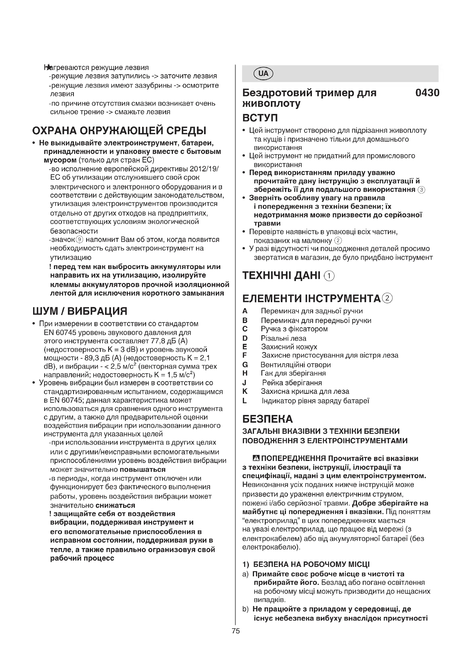 A Перемикач для задньої ручки B Перемикач для передньої ручки C Ручка з фіксатором D Різальні леза E Захисний кожух F Захисне пристосування для вістря леза G Вентиляційні отвори H Гак для зберігання J Рейка зберігання K Захисна кришка для леза L Індикатор рівня заряду батареї