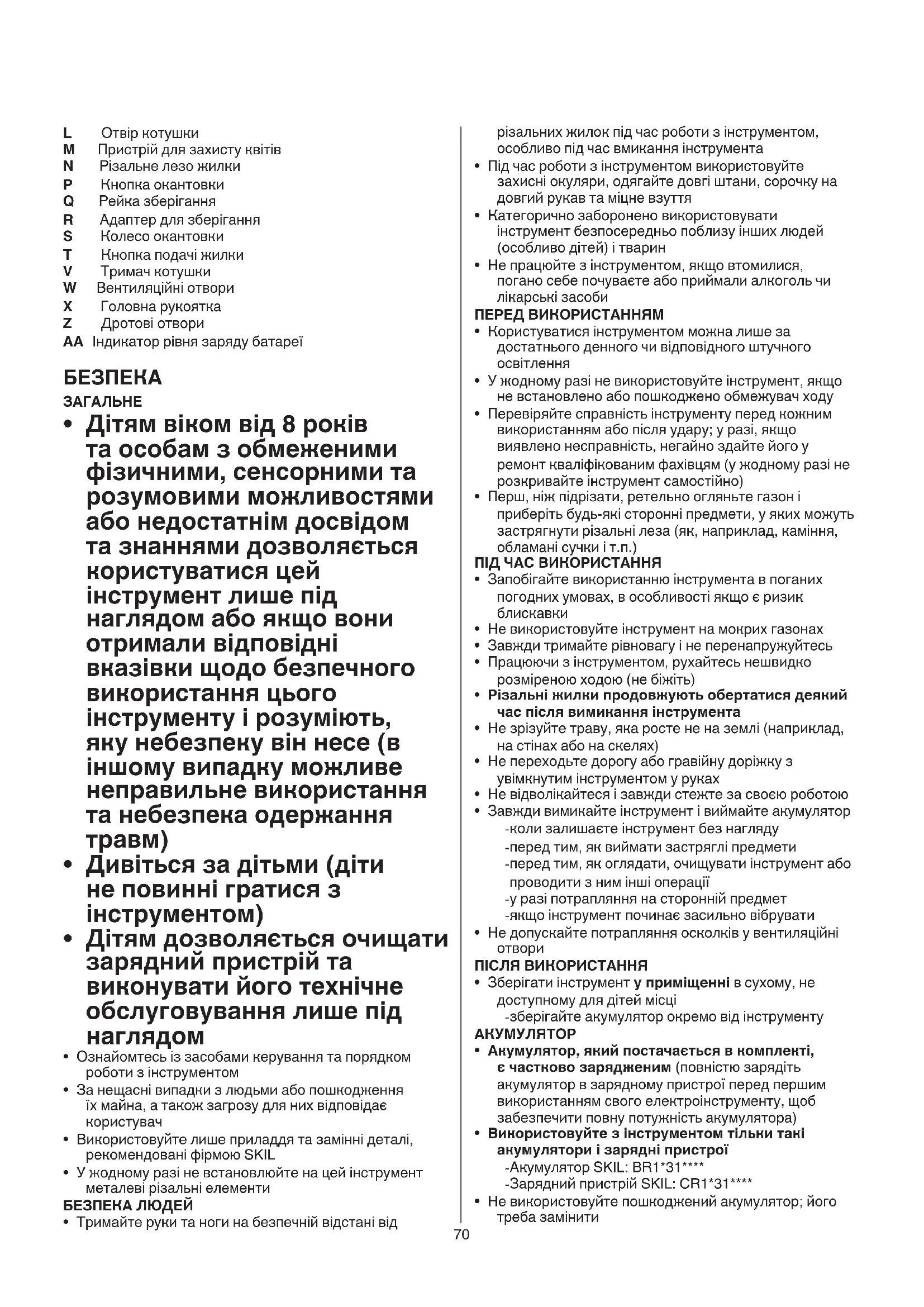 - Не використовуйте пошкоджений акумулятор; його треба замінити L Отвір котушки M Пристрій для захисту квітів N Різальне лезо жилки P Кнопка окантовки Q Рейка зберігання R Адаптер для зберігання S Колесо окантовки T Кнопка подачі жилки V Тримач котушки W Вентиляційні отвори X Головна рукоятка Z Дротові отвори AA Індикатор рівня заряду батареї