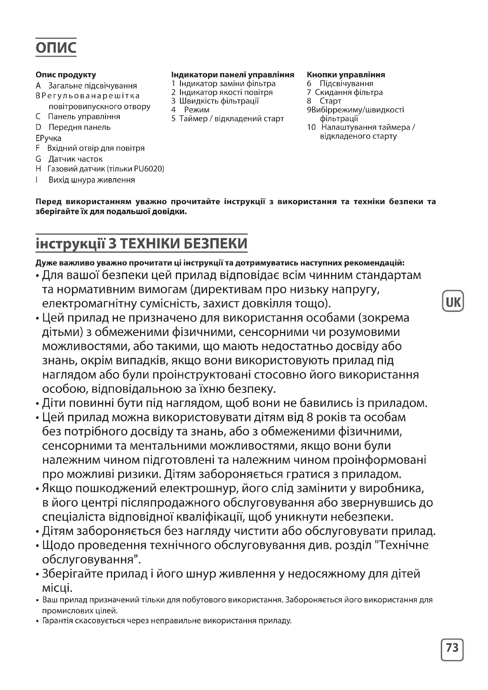 Опис продукту A Загальне підсвічування B Регульована решітка повітровипускного отвору C Панель управління D Передня панель E Ручка F Вхідний отвір для повітря G Датчик часток H Газовий датчик (тільки PU6020) I Вихід шнура живлення Індикатори панелі управління 1 Індикатор заміни фільтра 2 Індикатор якості повітря 3 Швидкість фільтрації 4 Режим 5 Таймер / відкладений старт Кнопки управління 6 Підсвічування 7 Скидання фільтра 8 Старт 9 Вибір режиму/швидкості