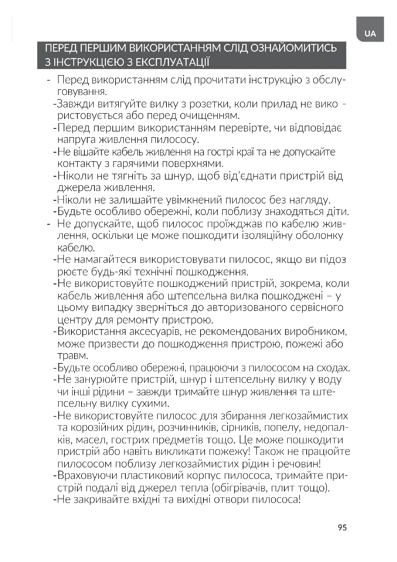 Враховуючи пластиковий корпус пилососа, тримайте при- стрій подалі від джерел тепла (обігрівачів, плит тощо). - Не закривайте вхідні та вихідні отвори пилососа!96