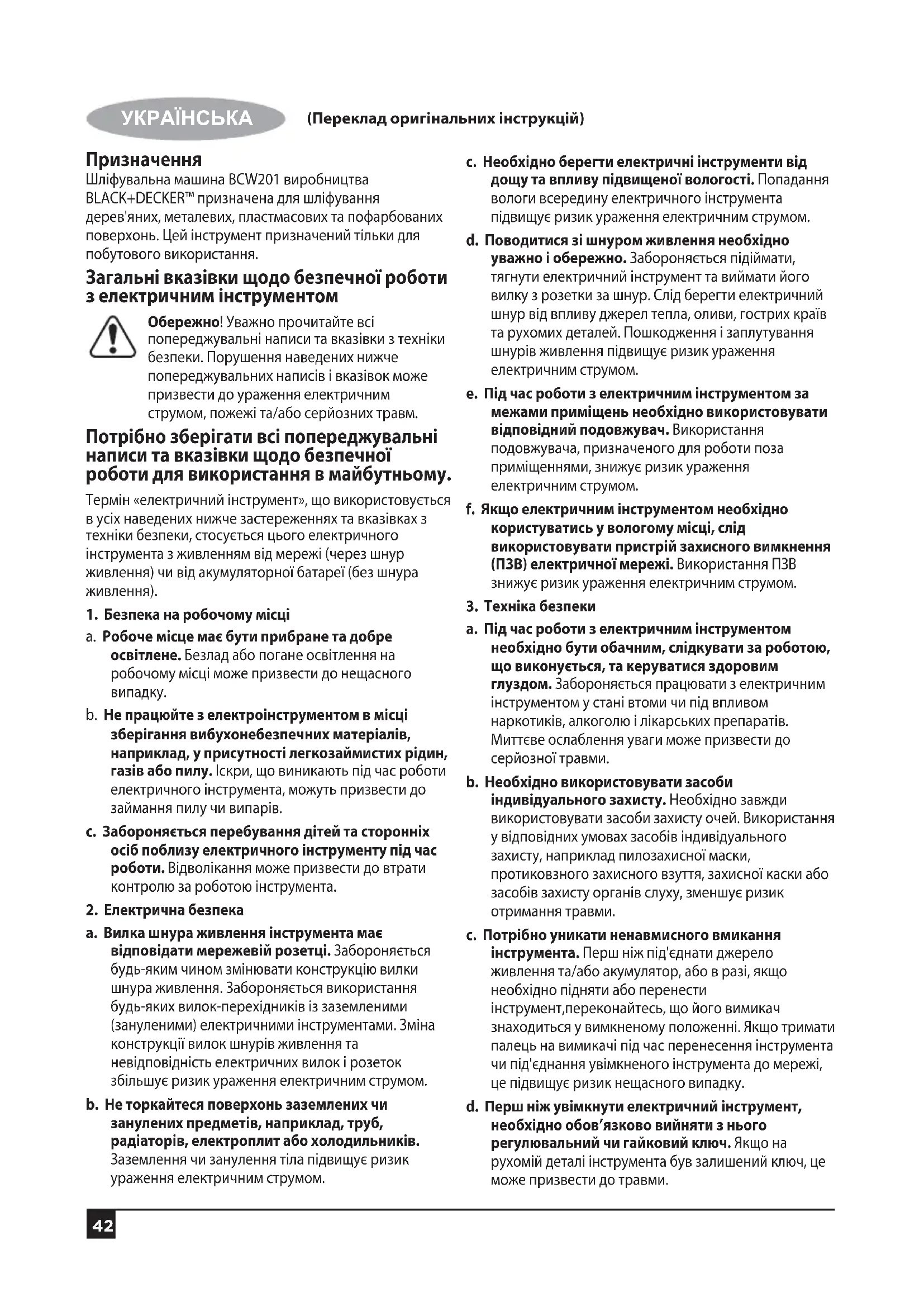 (Переклад оригінальних інструкцій) Призначення Шліфувальна машина BCW201 виробництва BLACK+DECKER™ призначена для шліфування дерев'яних, металевих, пластмасових та пофарбованих поверхонь. Цей інструмент призначений тільки для побутового використання. Загальні вказівки щодо безпечної роботи з електричним інструментом Обережно! Уважно прочитайте всі попереджувальні написи та вказівки з техніки безпеки. Порушення наведених нижче попереджувальних написів і вказівок може призвести до ураження електричним струмом, пожежі та/або серйозних травм. Потрібно зберігати всі попереджувальні написи та вказівки щодо безпечної роботи для використання в майбутньому. Термін «електричний інструмент», що використовується в усіх наведених нижче застереженнях та вказівках з техніки безпеки, стосується цього електричного інструмента з живленням від мережі (через шнур живлення) чи від акумуляторної батареї (без шнура