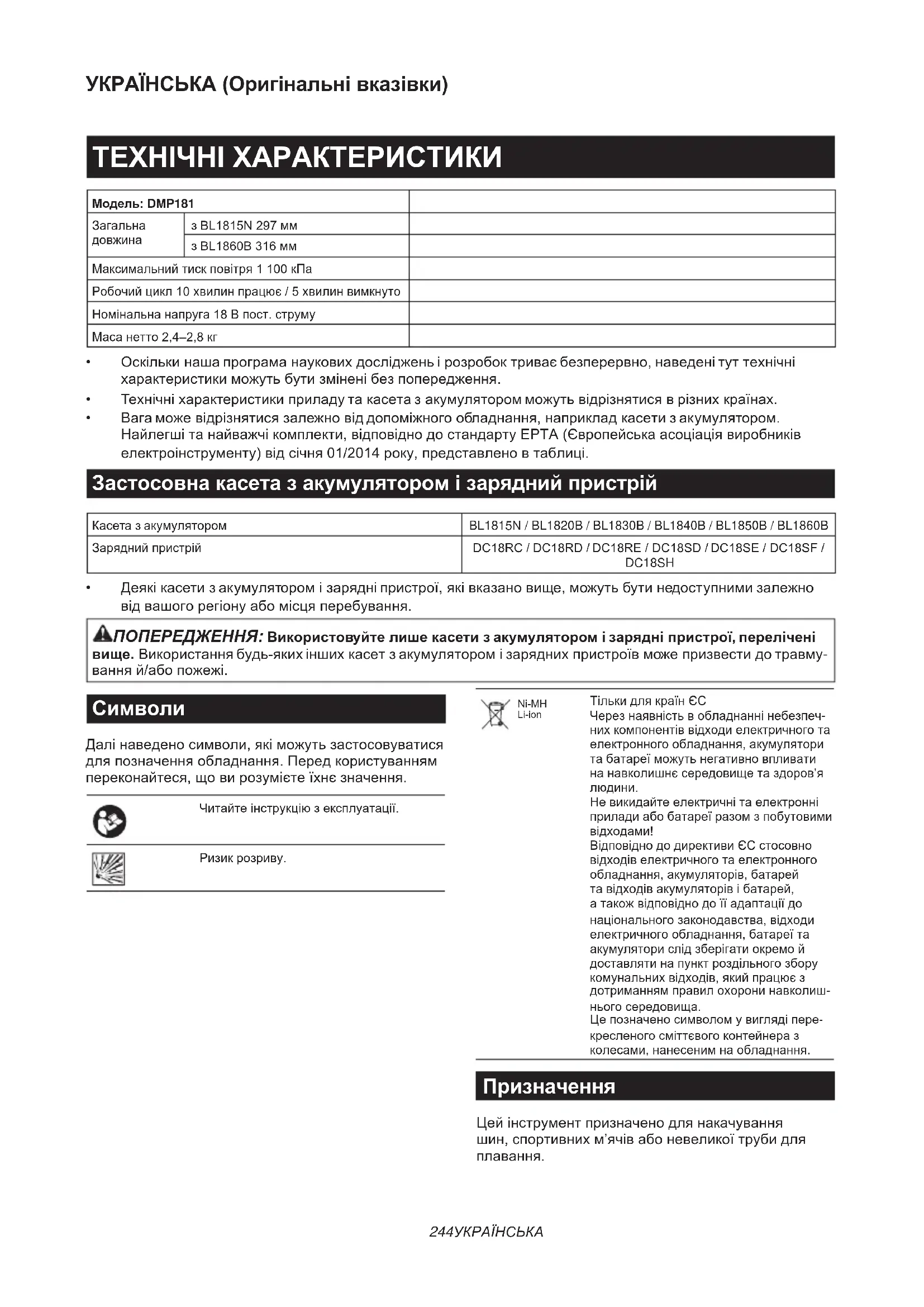 Відповідно до директиви ЄС стосовно відходів електричного та електронного обладнання, акумуляторів, батарей та відходів акумуляторів і батарей, а також відповідно до її адаптації до національного законодавства, відходи електричного обладнання, батареї та акумулятори слід зберігати окремо й доставляти на пункт роздільного збору комунальних відходів, який працює з дотриманням правил охорони навколиш- нього середовища. Це позначено символом у вигляді пере- кресленого сміттєвого контейнера з колесами, нанесеним на обладнання. Призначення Цей інструмент призначено для накачування шин, спортивних м’ячів або невеликої труби для плавання.245 УКРАЇНСЬКА