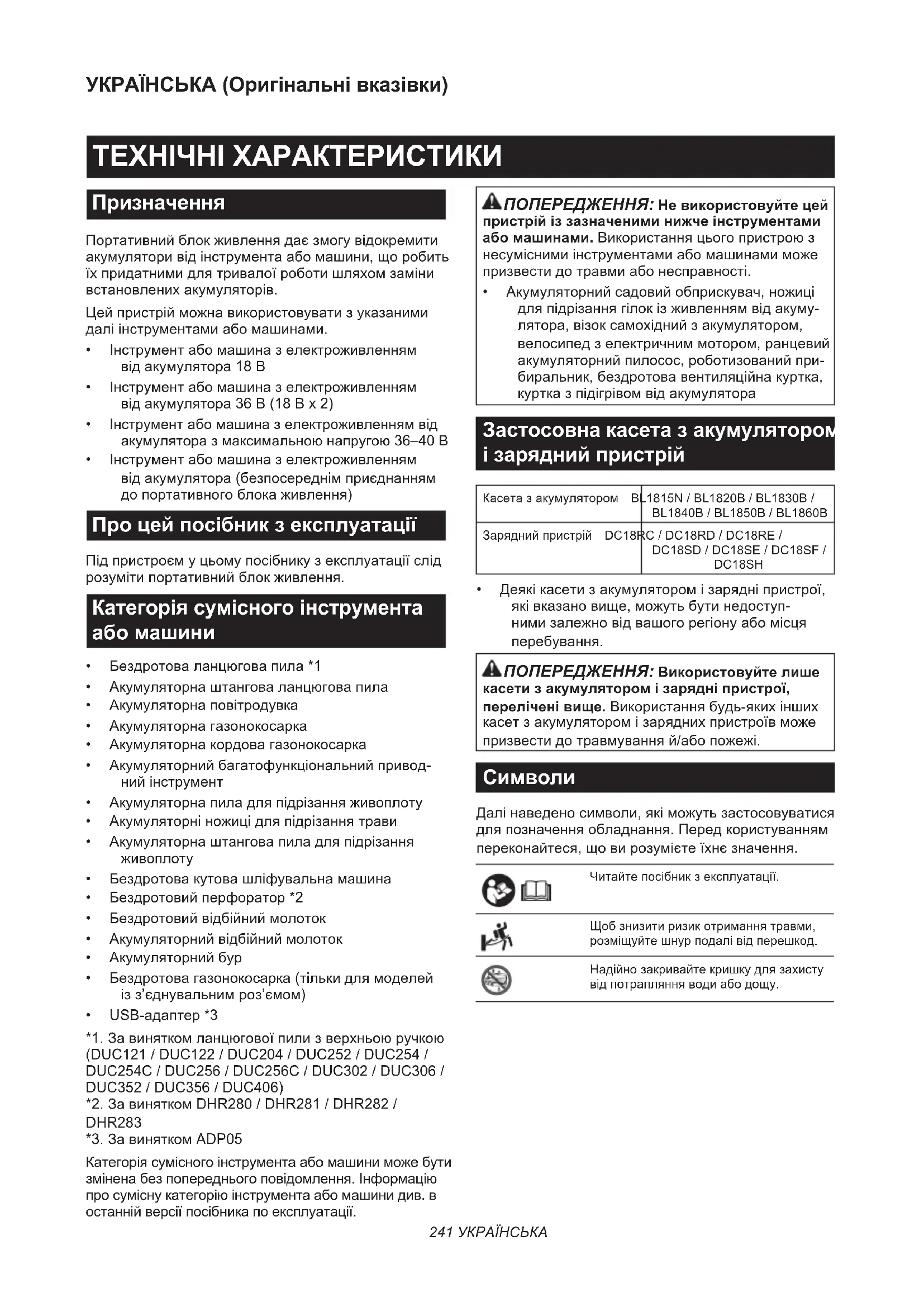 DUC254C/DUC256/DUC256C/DUC302/DUC306/ DUC352/DUC356/DUC406) *2.ЗавиняткомDHR280/DHR281/DHR282/ DHR283 *3.ЗавиняткомADP05 Категоріясумісногоінструментаабомашиниможебути зміненабезпопередньогоповідомлення.Інформацію просуміснукатегоріюінструментаабомашинидив.в останнійверсіїпосібникапоексплуатації. ПОПЕРЕДЖЕННЯ: Не використовуйте цей пристрій із зазначеними нижче інструментами або машинами.Використанняцьогопристроюз несуміснимиінструментамиабомашинамиможе призвестидотравмиабонесправності.