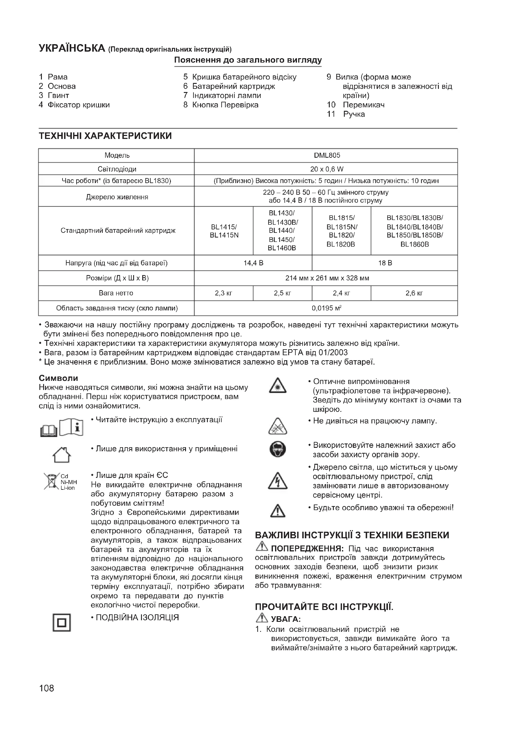 використовується, завжди вимикайте його та виймайте/знімайте з нього батарейний картридж. Модель DML805 Світлодіоди 20 x 0,6 W Час роботи* (із батареєю BL1830) (Приблизно) Висока потужність: 5 годин / Низька потужність: 10 годин Джерело живлення 220 – 240 В 50 – 60 Гц змінного струму або 14,4 В / 18 В постійного струму Стандартний батарейний картридж BL1415/ BL1415N BL1430/ BL1430B/ BL1440/ BL1450/ BL1460B BL1815/ BL1815N/ BL1820/ BL1820B BL1830/BL1830B/ BL1840/BL1840B/ BL1850/BL1850B/ BL1860B Напруга (під час дії від батареї) 14,4 В 18 В Розміри (Д x Ш x В) 214 мм x 261 мм x 328 мм Вага нетто 2,3 кг 2,5 кг 2,4 кг 2,6 кг Область завдання тиску (скло лампи) 0,0195 м